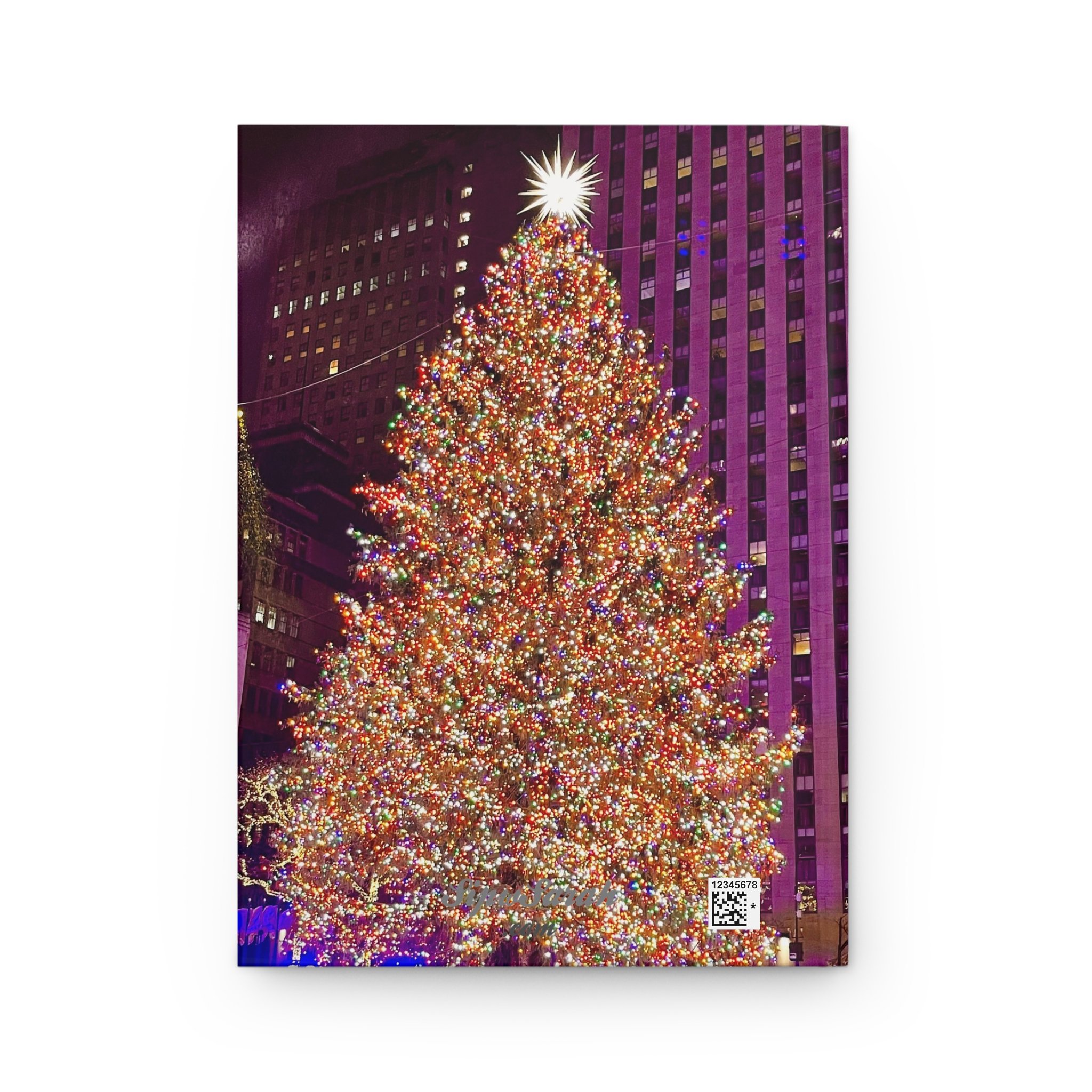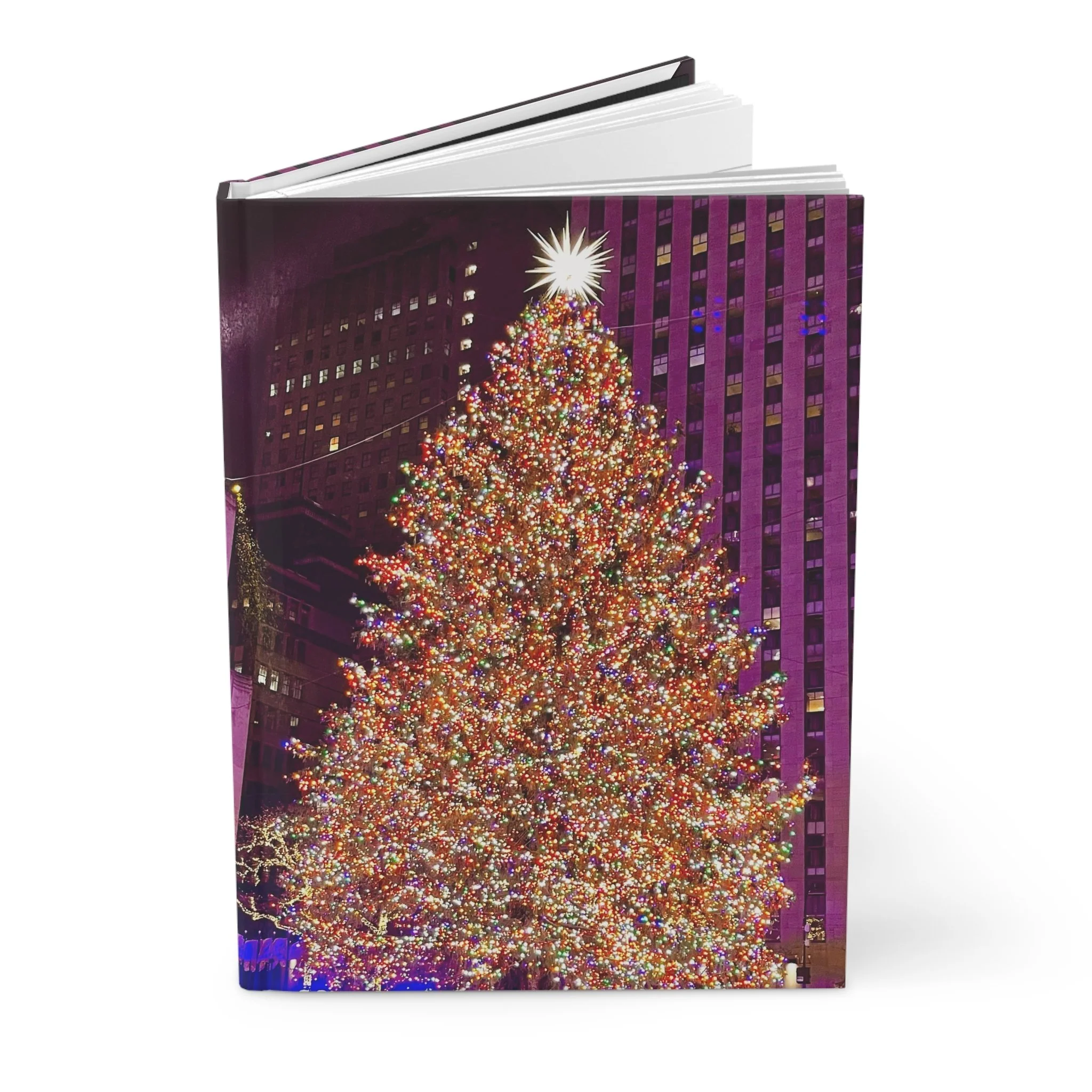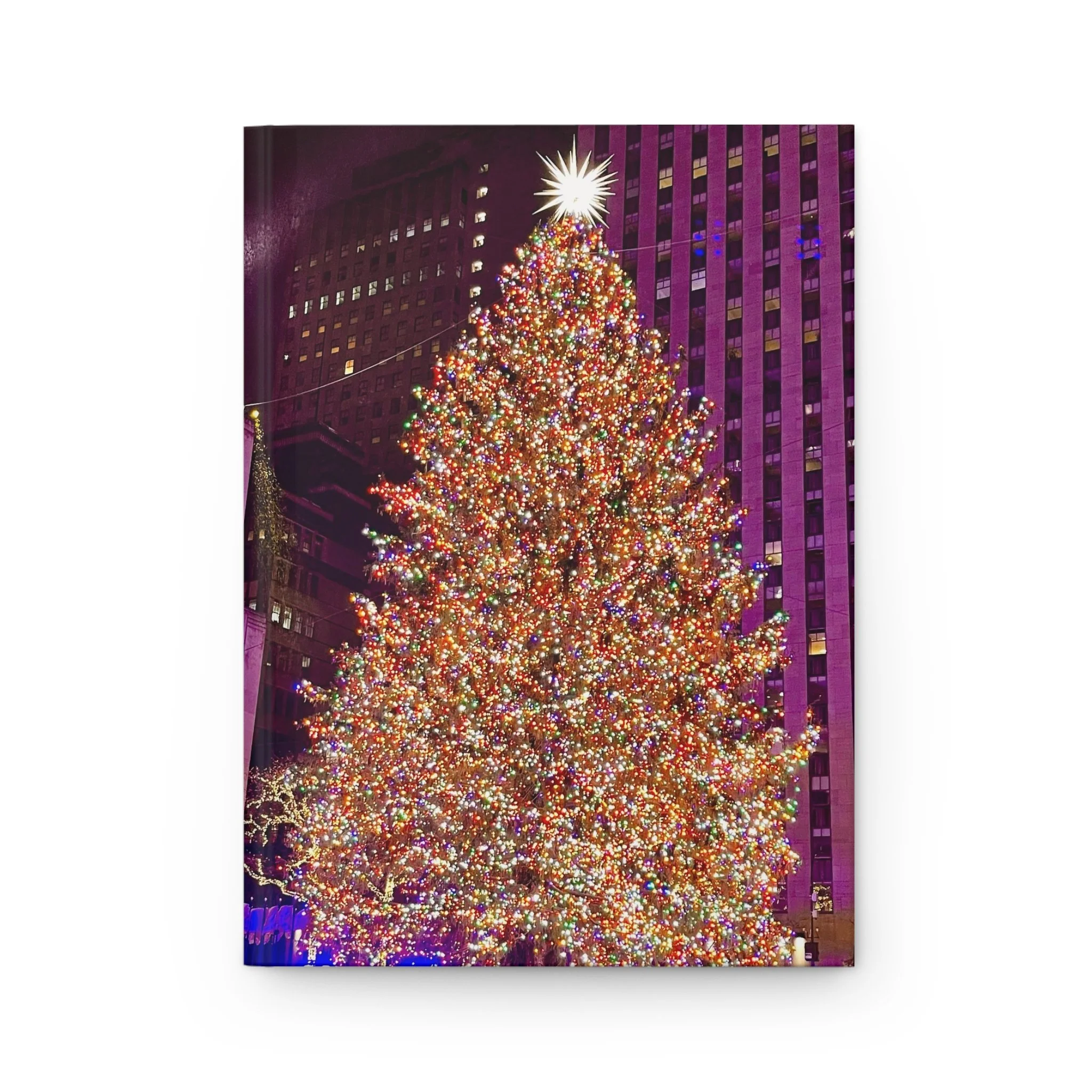 A hardcover matte journal that captures the sparkle of city holiday nights with the Rockefeller Center Christmas Tree Lighting. The cover shows a towering, brilliantly lit Christmas tree against a backdrop of urban architecture, printed edge-to-edge in vivid, saturated colors. The sewn casewrap binding gives the book a flexible, durable spine that lies