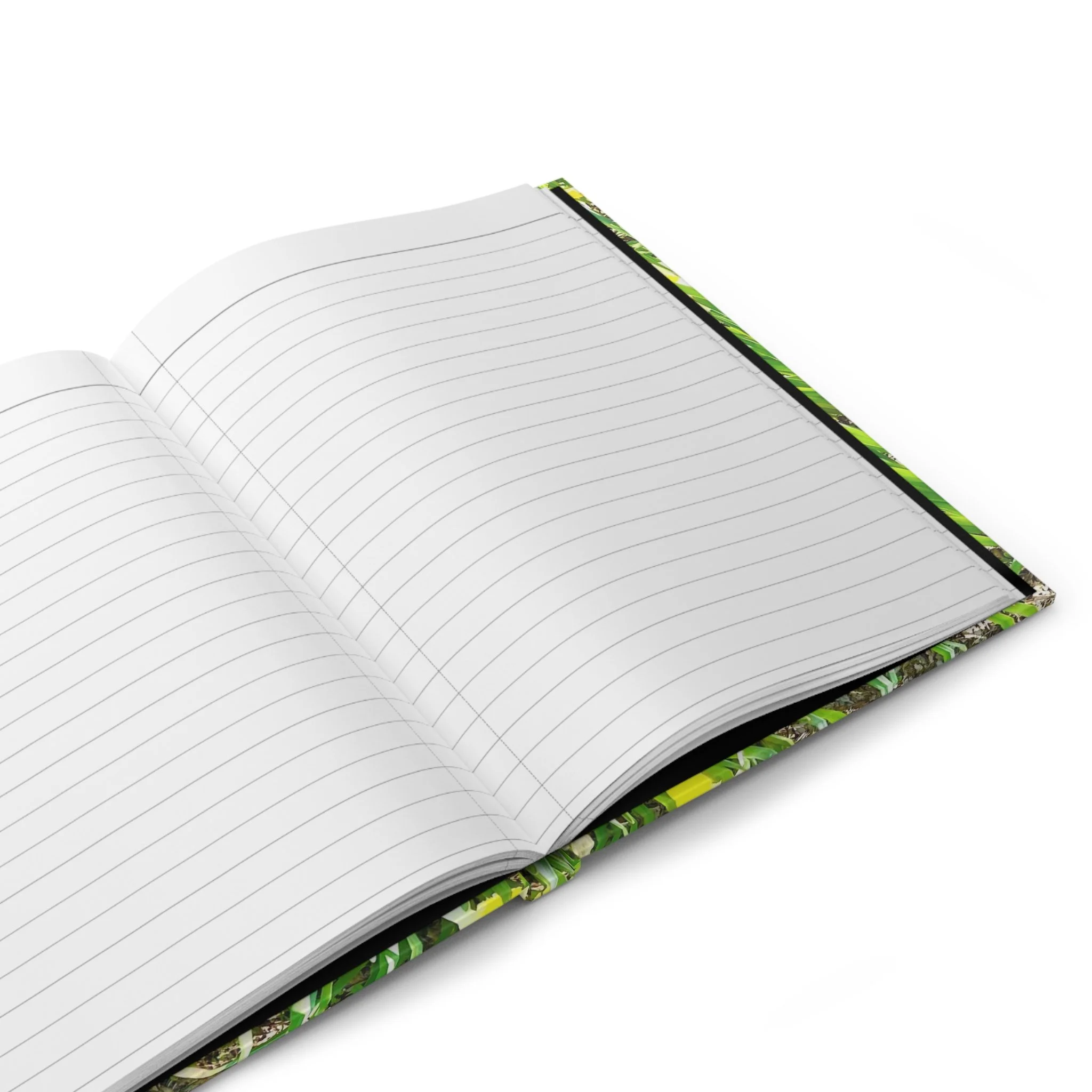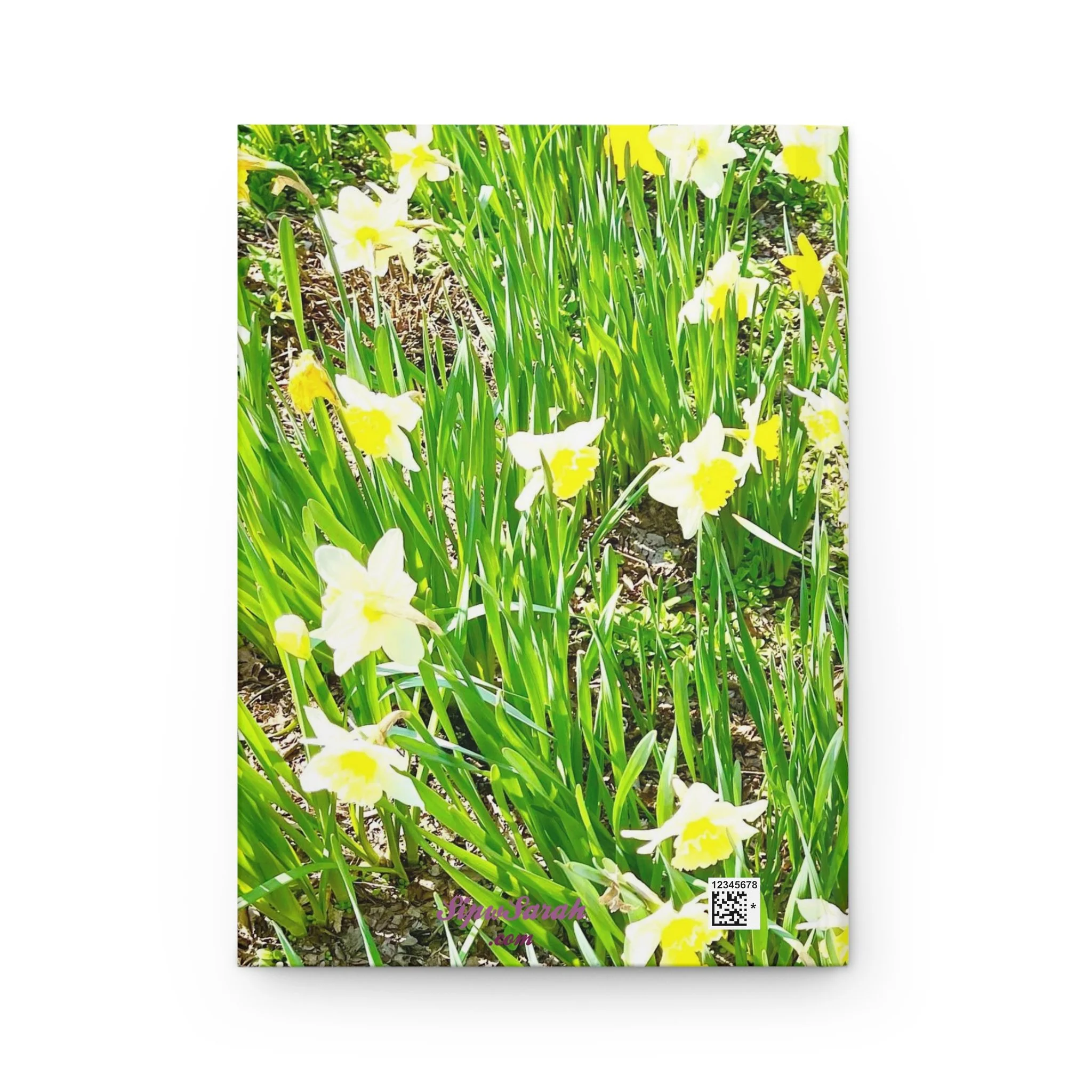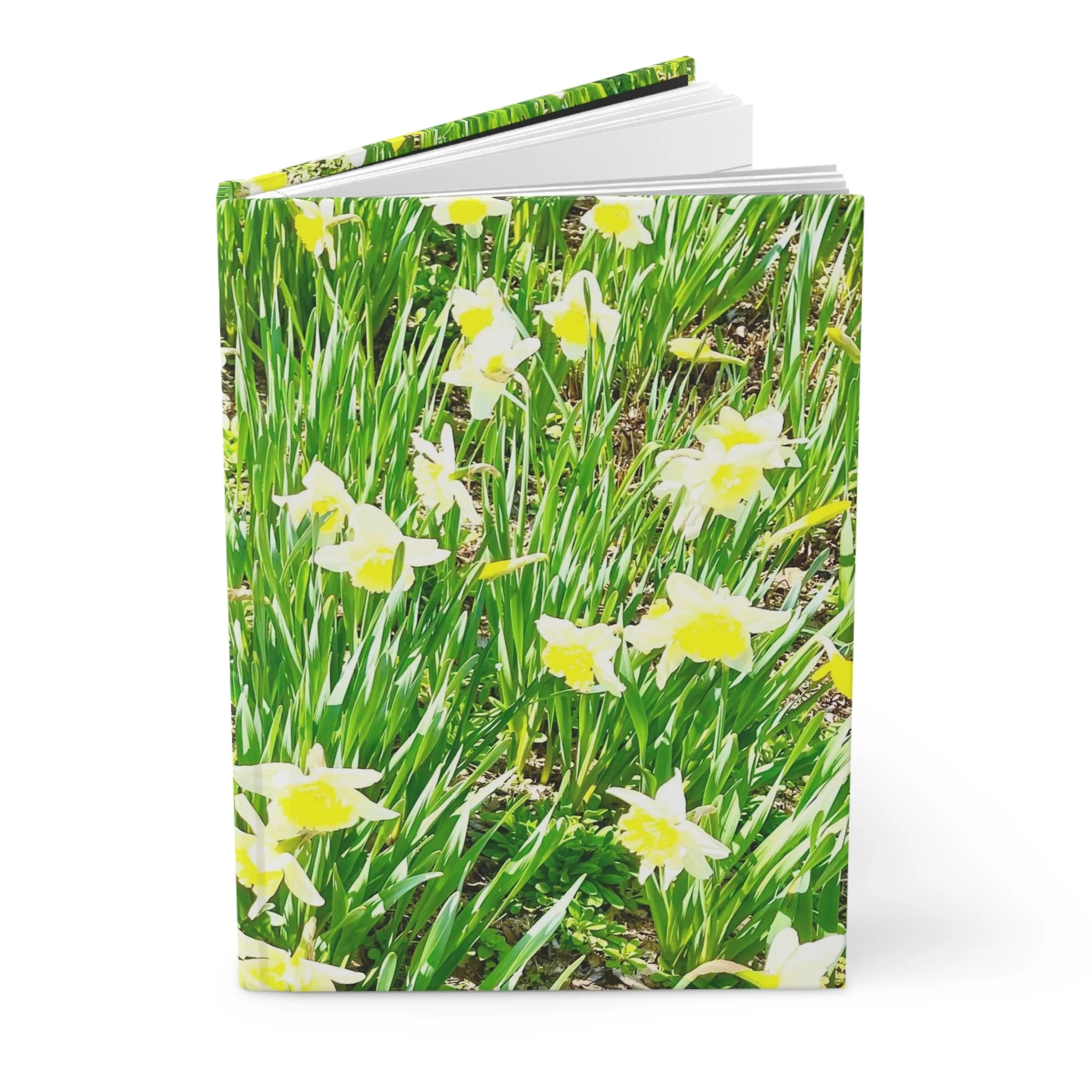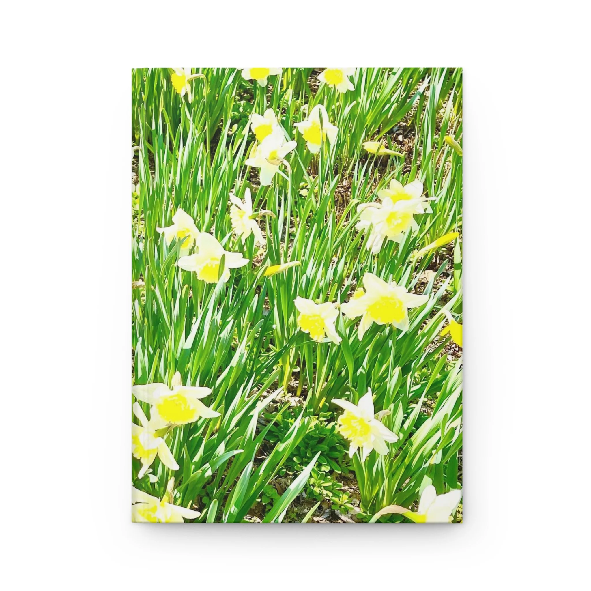 A matte hardcover journal wrapped in a lively field of daffodils. The bright greens and sunny yellow blossoms spill across the full-wrap cover, inviting you to slow down and capture small moments — lists, sketches, morning pages, or garden plans. The sewn casewrap binding lets the notebook open flat and feel comfortable in hand. Pages are lined and perforated, so you can neatly remove sheets when you want to share a note or tuck a sketch into a recipe box. The durable matte lamination keeps colors vivid while softening glare, so this journal looks at home on a bench, kitchen table, or tucked into a tote for a walk in the park.
