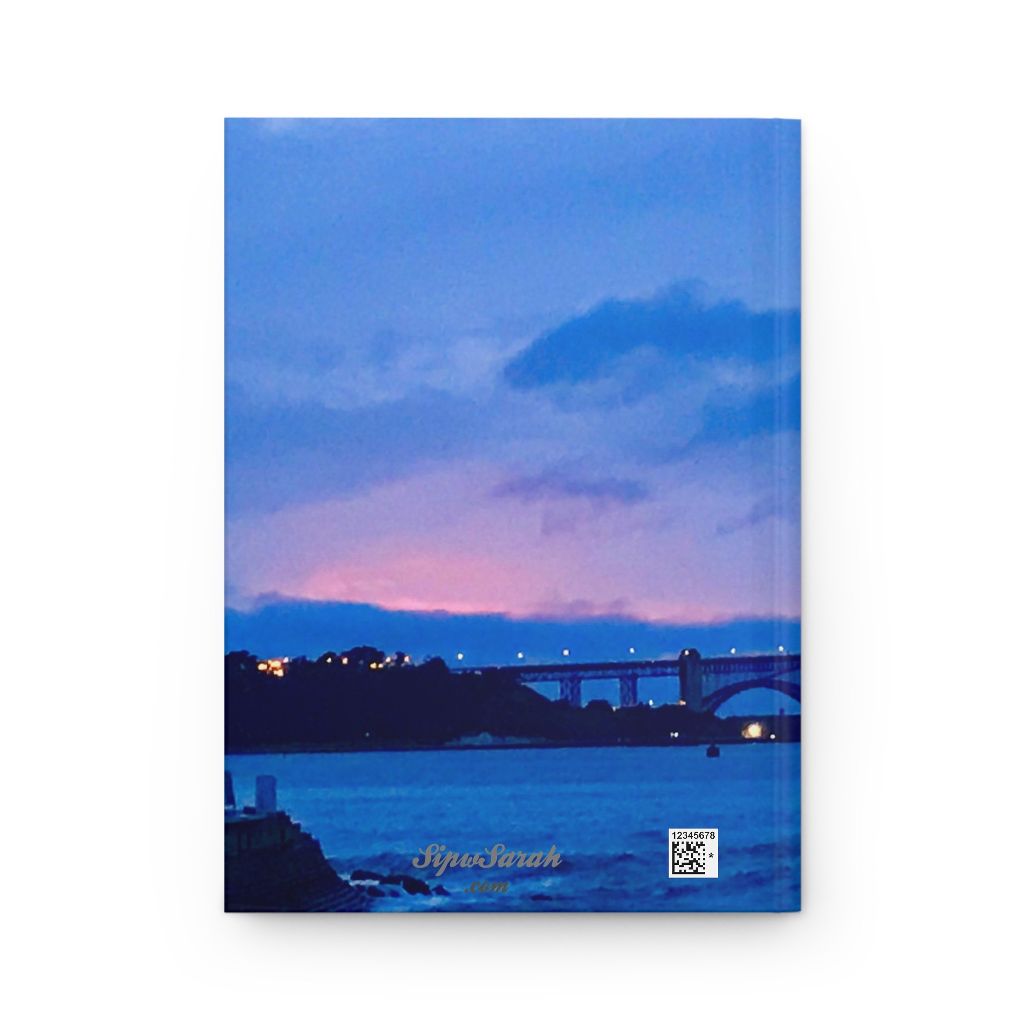A hardcover matte journal wrapped in a tranquil twilight seascape. The cover shows a softly lit bridge stretching across calm water under a deepening indigo sky — the scene holds a quiet, reflective mood that invites slow thoughts and small stories. Inside, 150 lined pages lie flat thanks to the sewn casewrap binding, while perforated sheets allow you to share or remove pages without tearing the rest. The full-wrap print and vivid color reproduction keep the image immersive, and the matte laminated finish gives the cover a smooth, tactile feel that resists wear as the journal travels from desk to bag to bedside table. This journal slips easily into the rhythm of evening routines, long ferry rides, or the pause between meetings — a place to sketch plans, record observations, and hold onto moments of stillness.