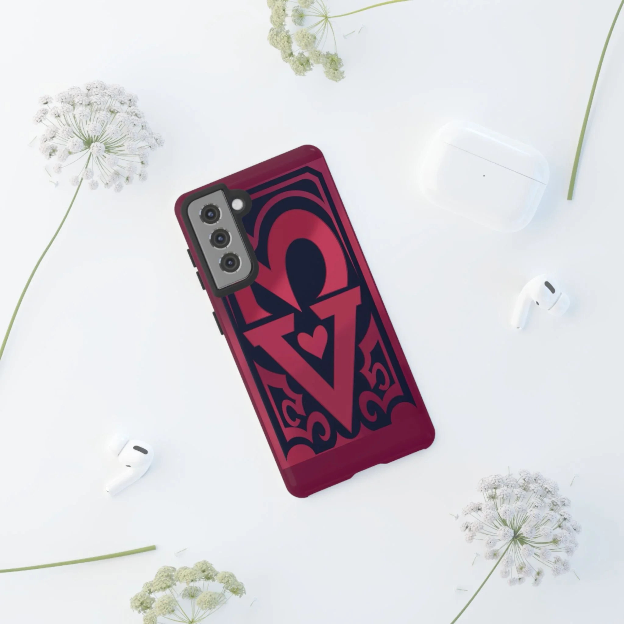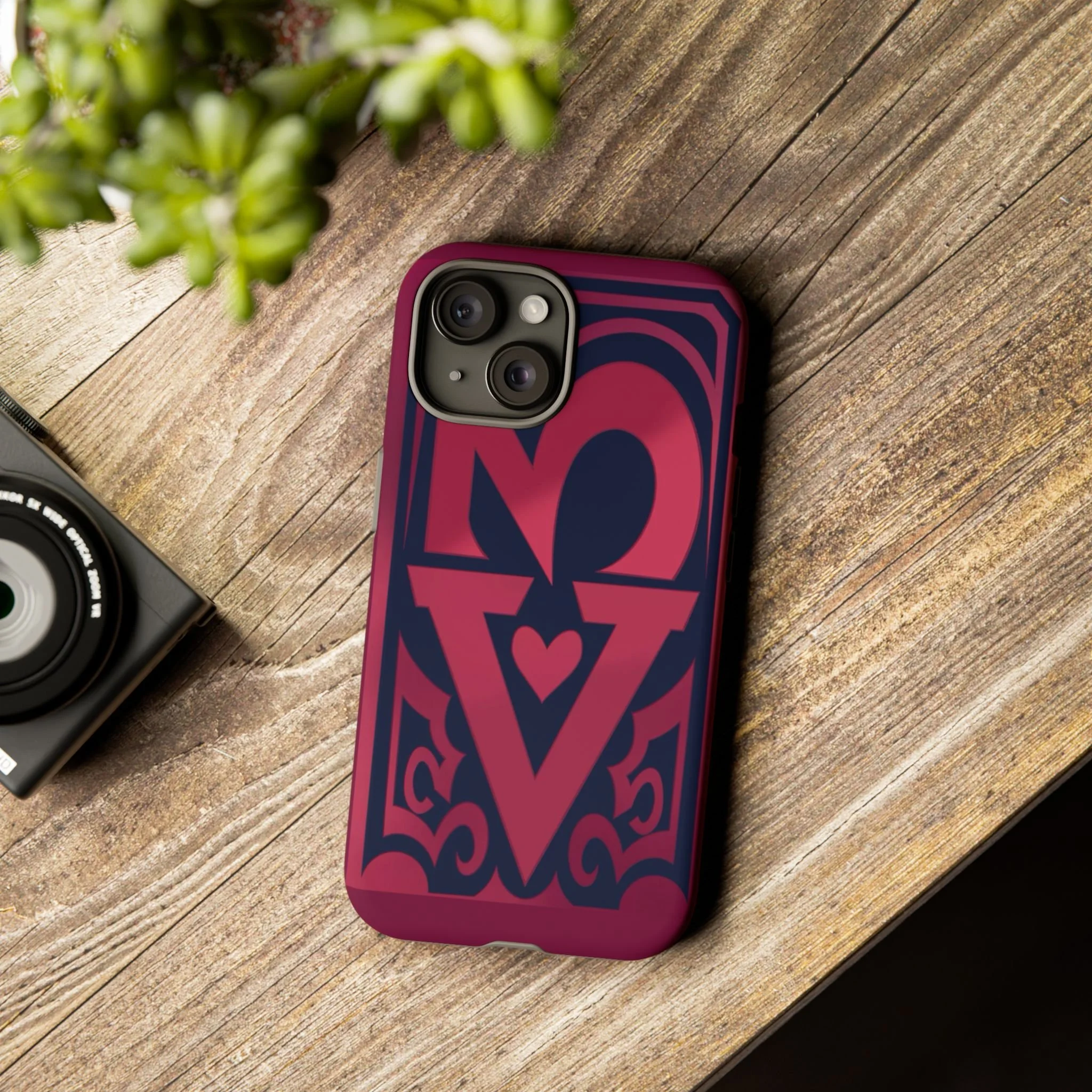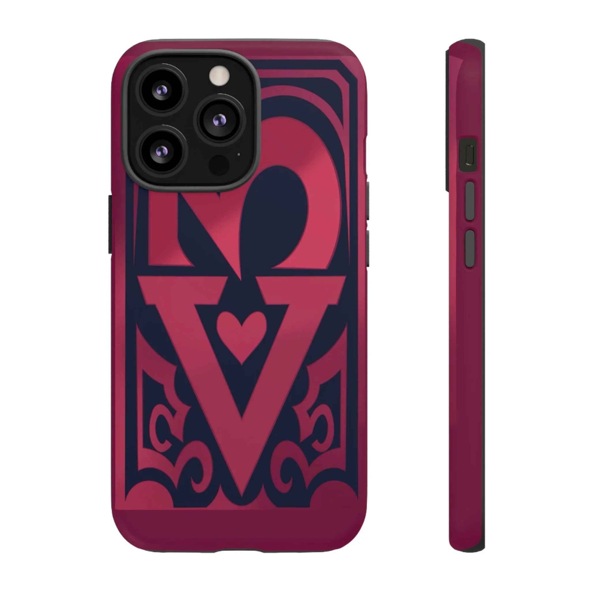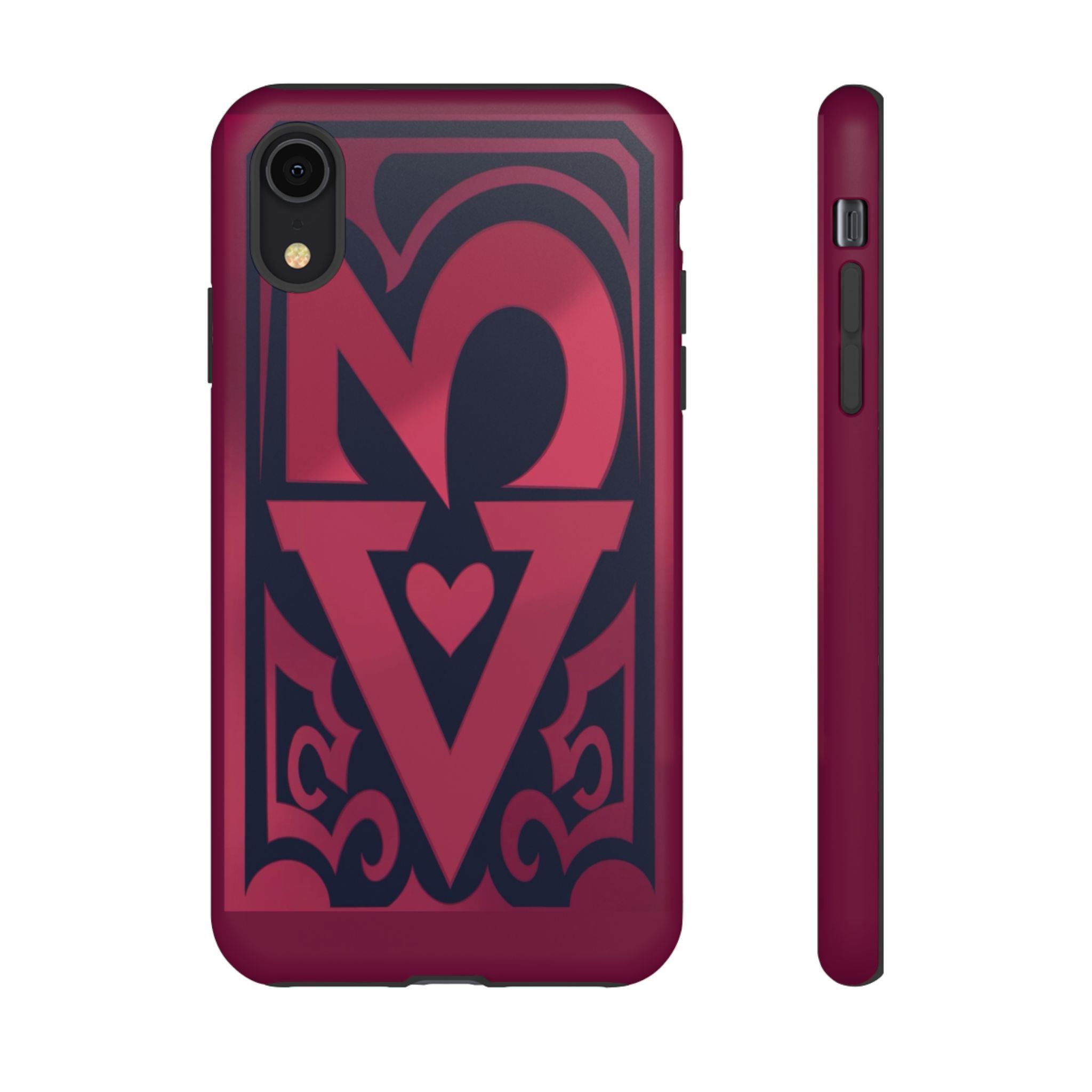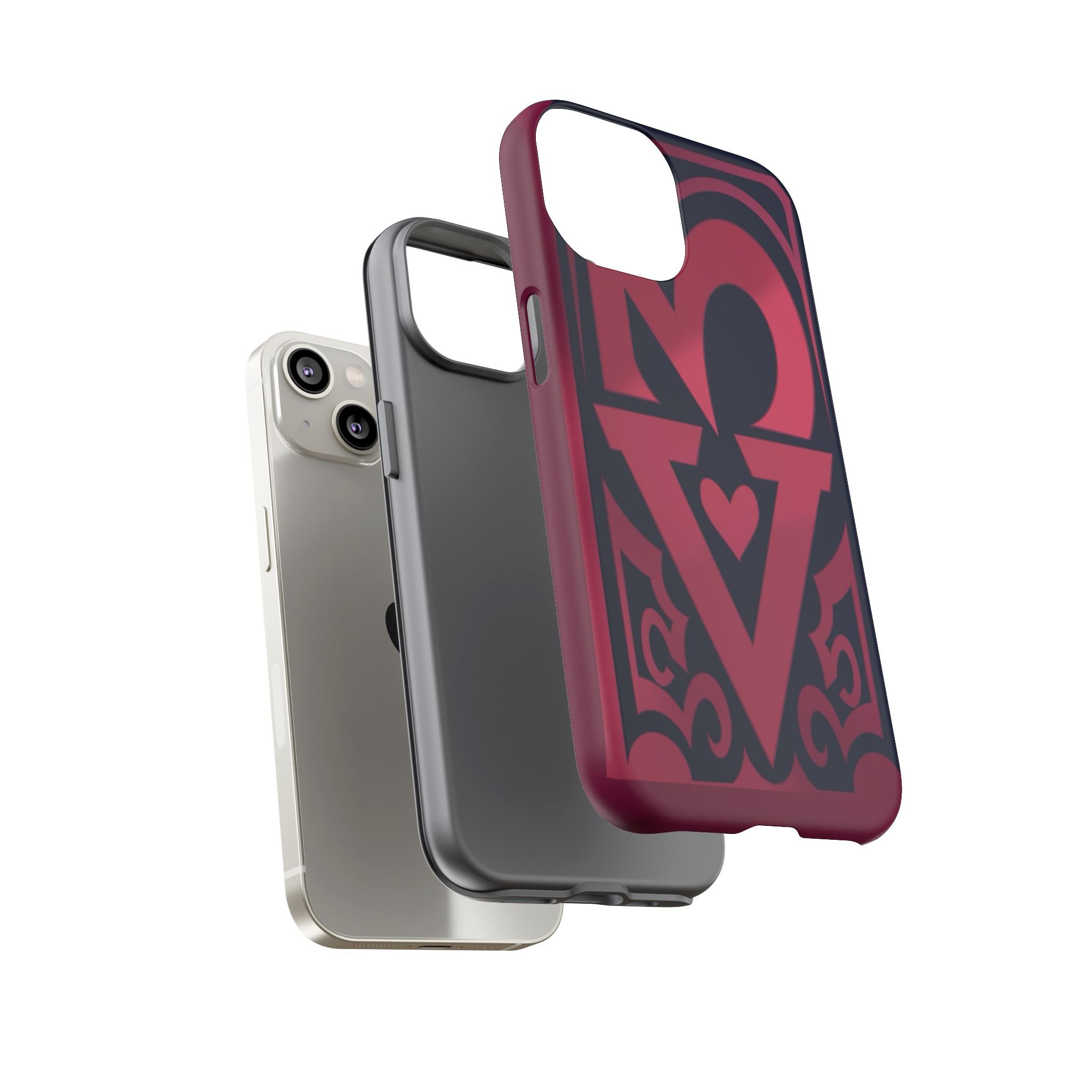 This protective phone case wraps your device in bold, graphic style and reliable defense. A deep burgundy shell frames a dark navy emblem — a stylized heart-and-V motif with decorative filigree — giving the case a modern, slightly gothic look that reads as both romantic and edgy. The dual-layer construction (hard polycarbonate exterior and soft TPU silicone liner) soaks up shocks and resists impacts, while the 3D wrap print keeps the design vivid across the curved edges. Finished options in glossy or matte let you choose the feel you prefer, and clear port cutouts keep charging and audio simple. Weather-resistant coatings and safety certifications mean it’s built to last and safe to use every day.