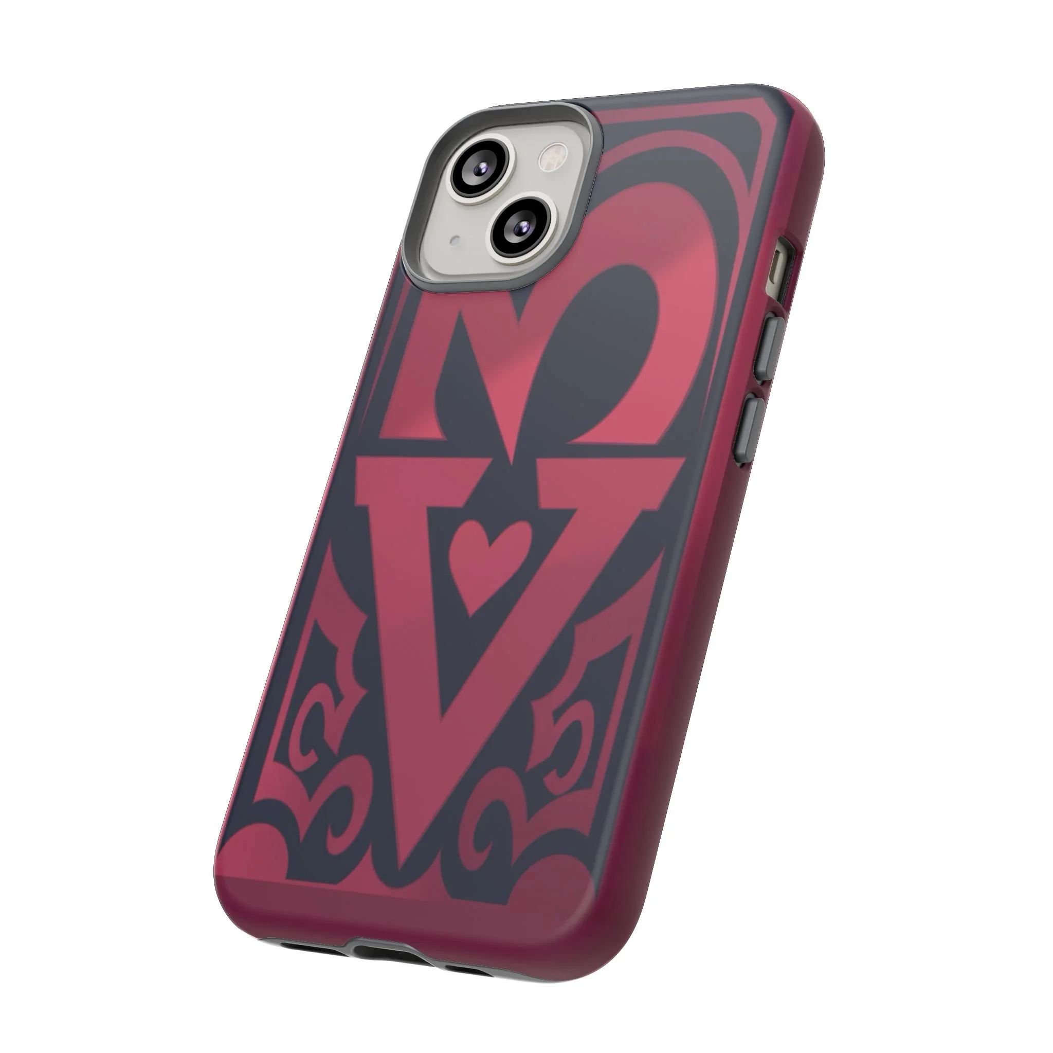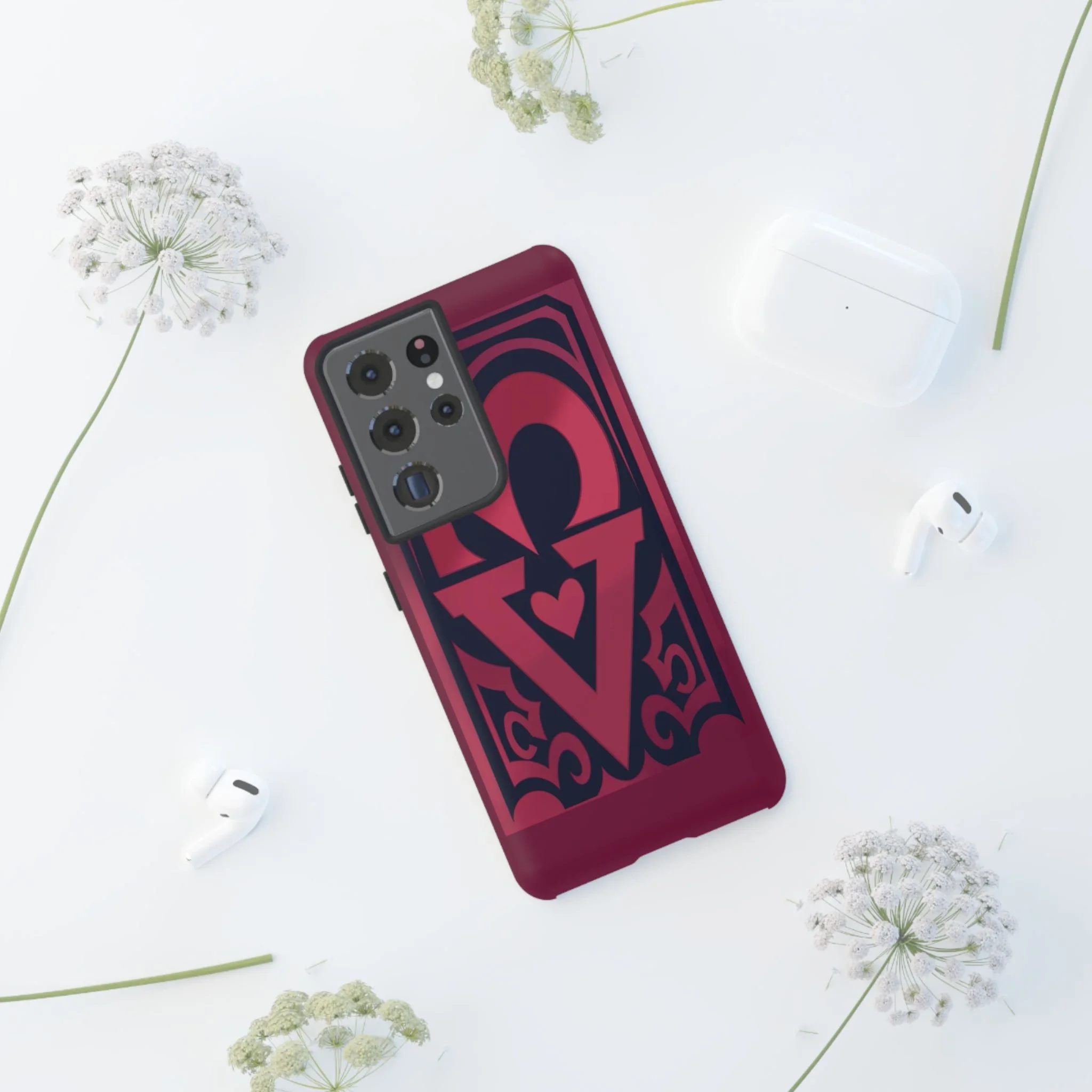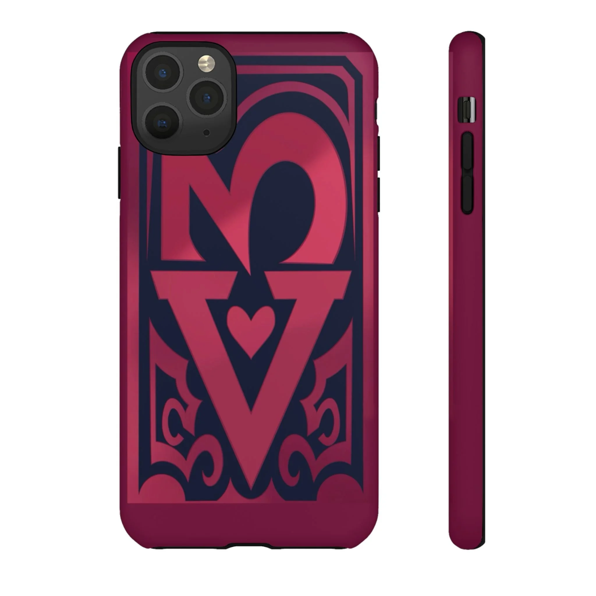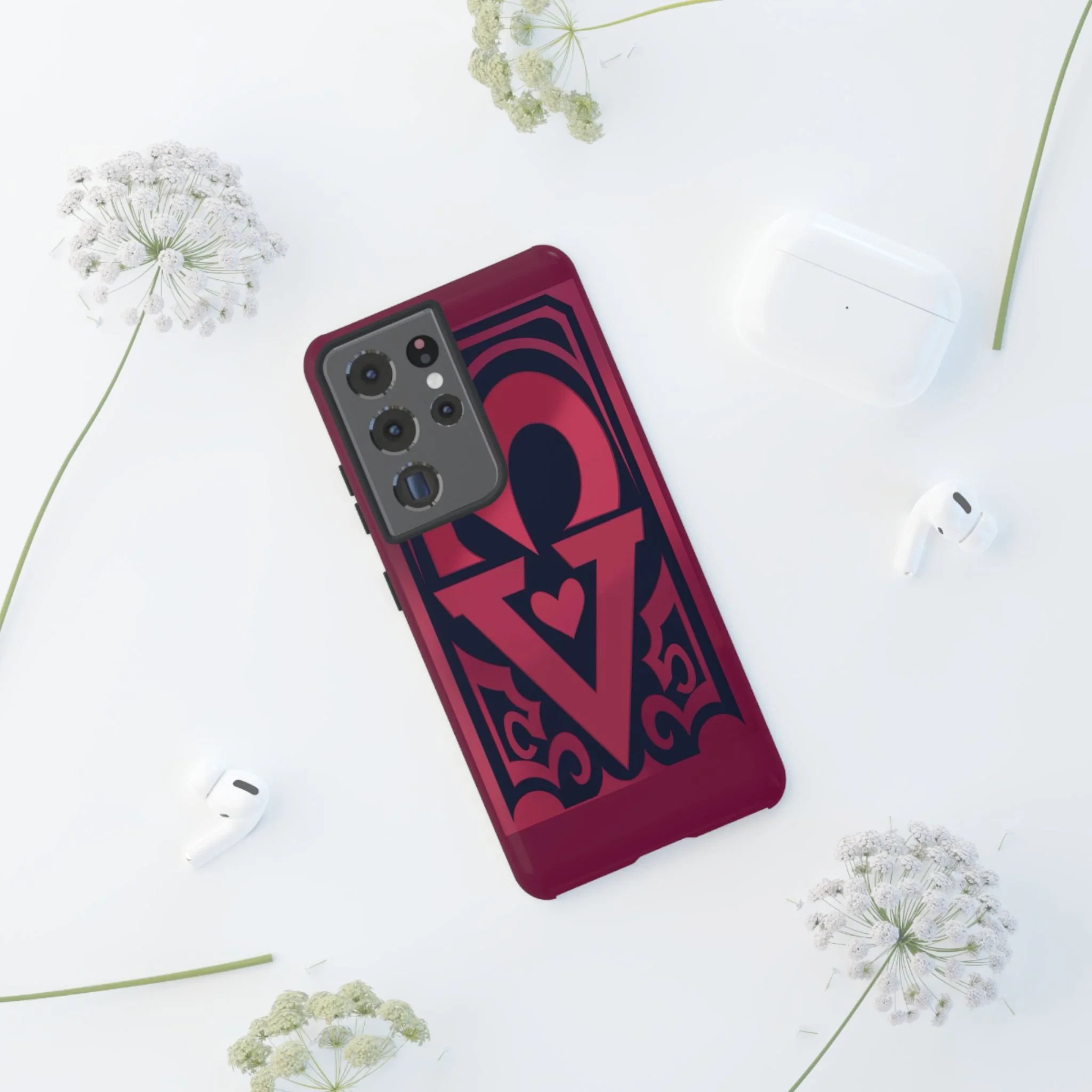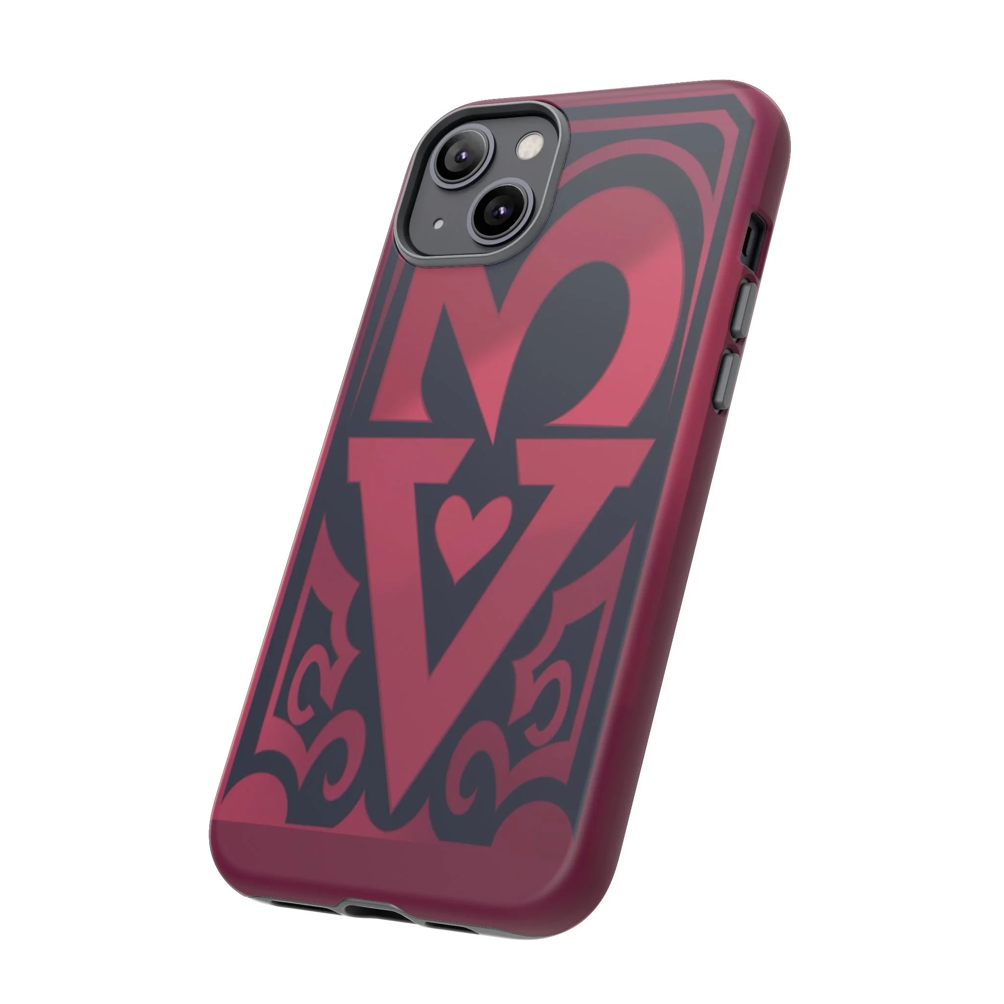 This protective phone case wraps your device in bold, graphic style and reliable defense. A deep burgundy shell frames a dark navy emblem — a stylized heart-and-V motif with decorative filigree — giving the case a modern, slightly gothic look that reads as both romantic and edgy. The dual-layer construction (hard polycarbonate exterior and soft TPU silicone liner) soaks up shocks and resists impacts, while the 3D wrap print keeps the design vivid across the curved edges. Finished options in glossy or matte let you choose the feel you prefer, and clear port cutouts keep charging and audio simple. Weather-resistant coatings and safety certifications mean it’s built to last and safe to use every day.