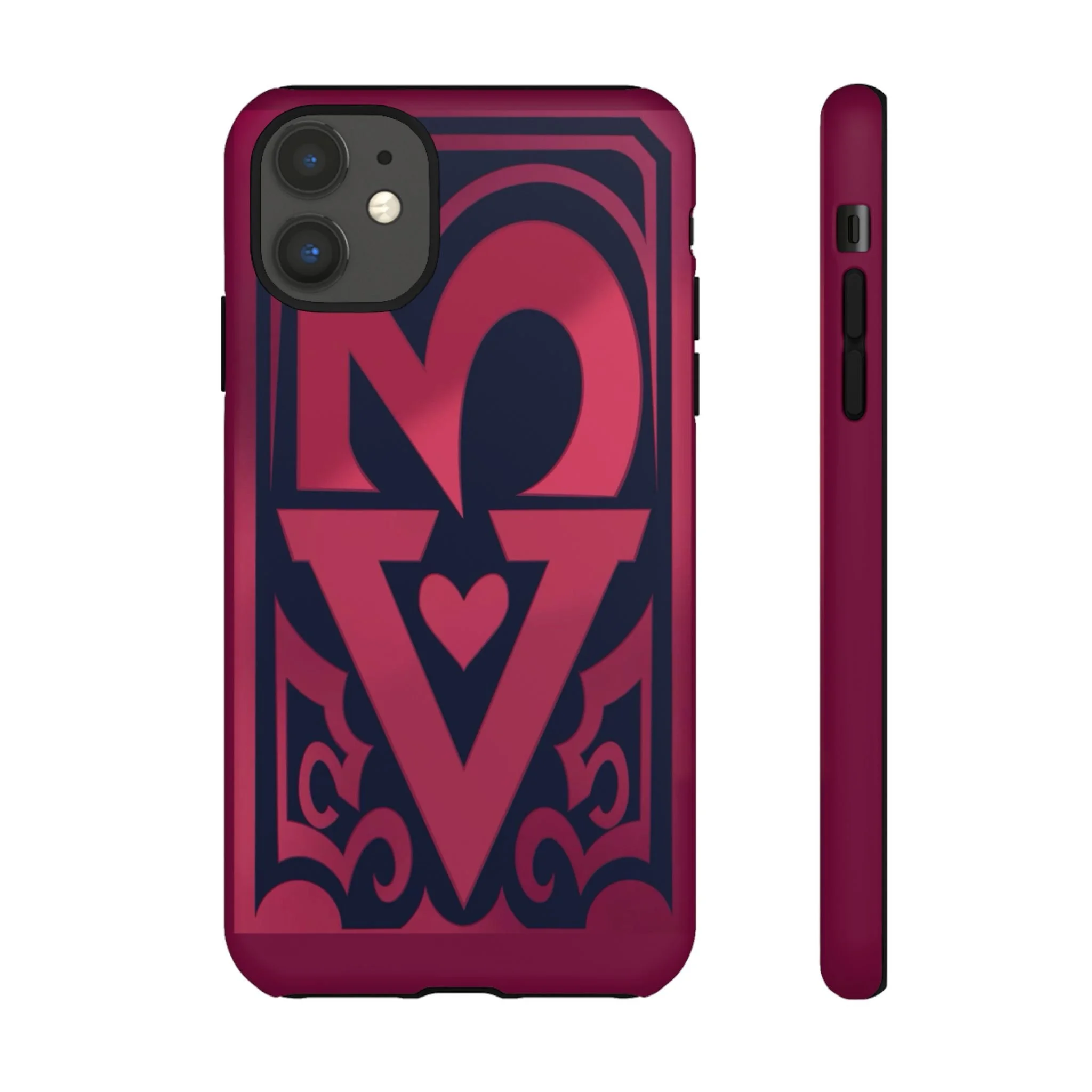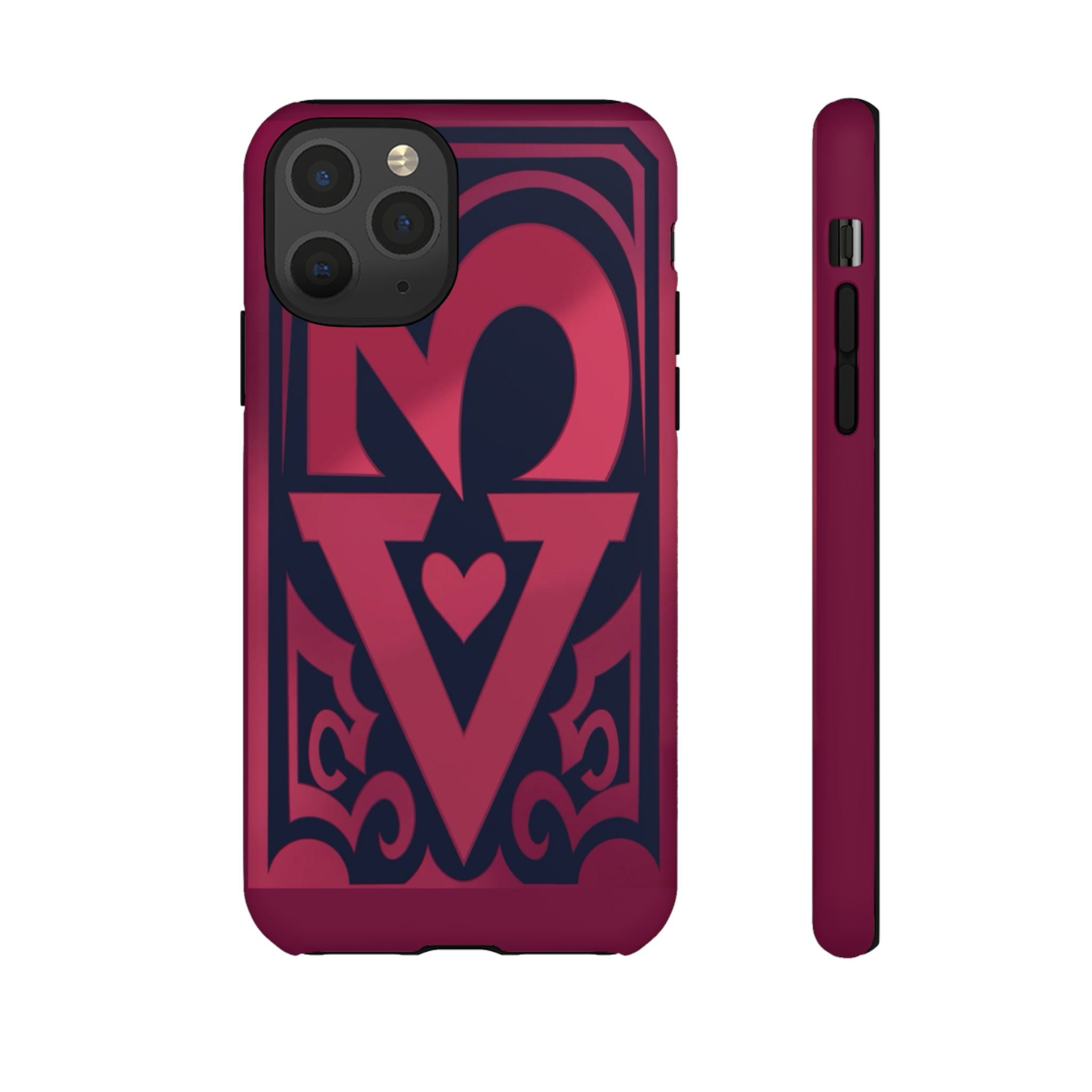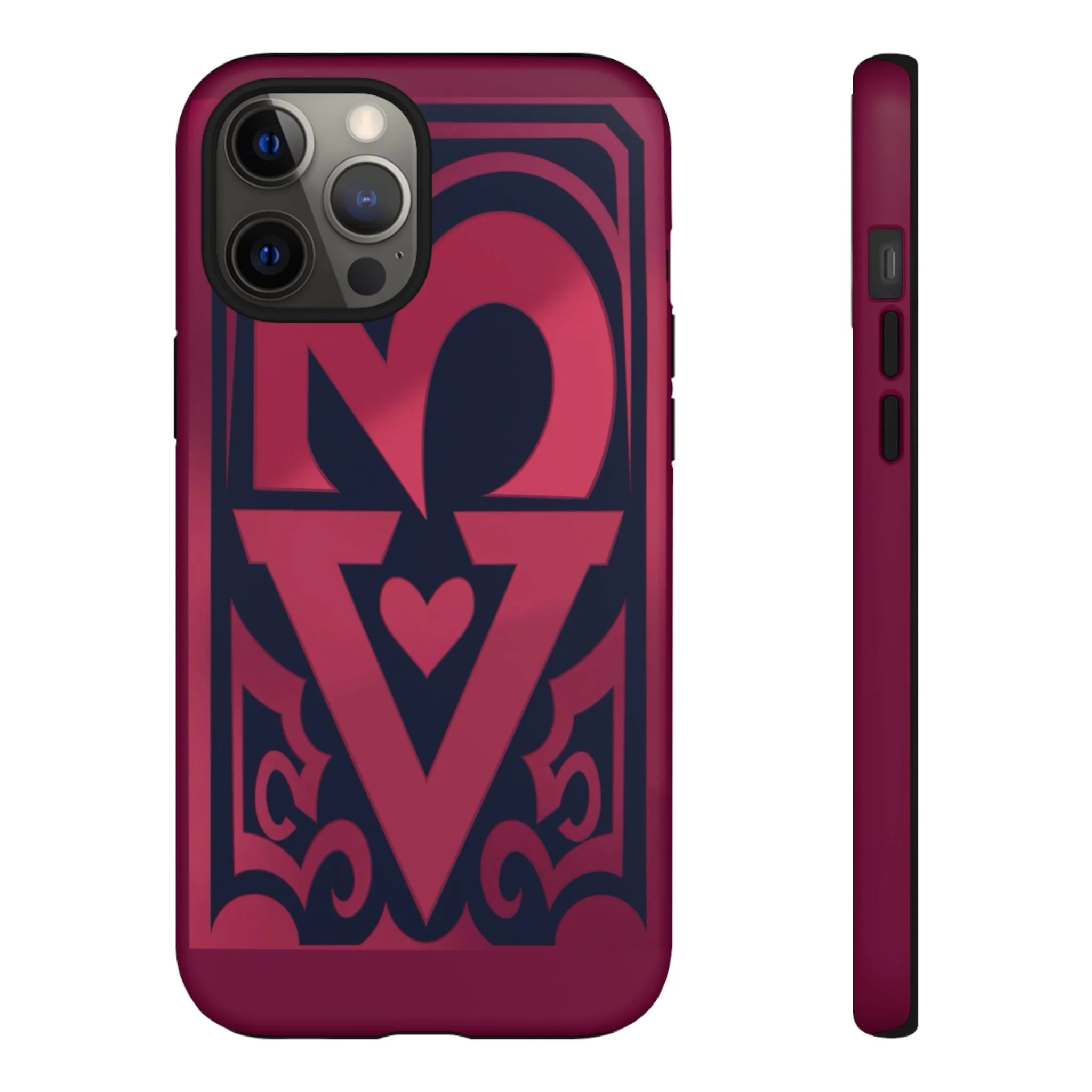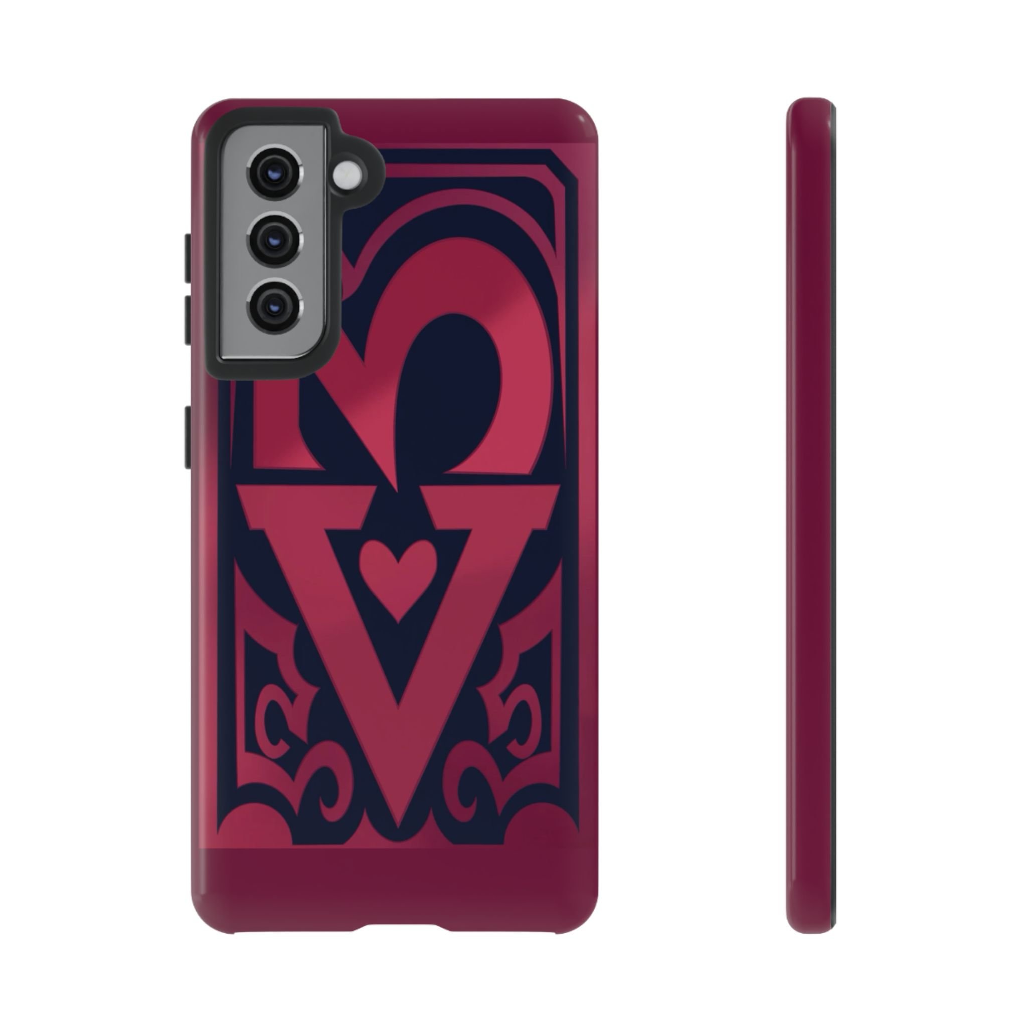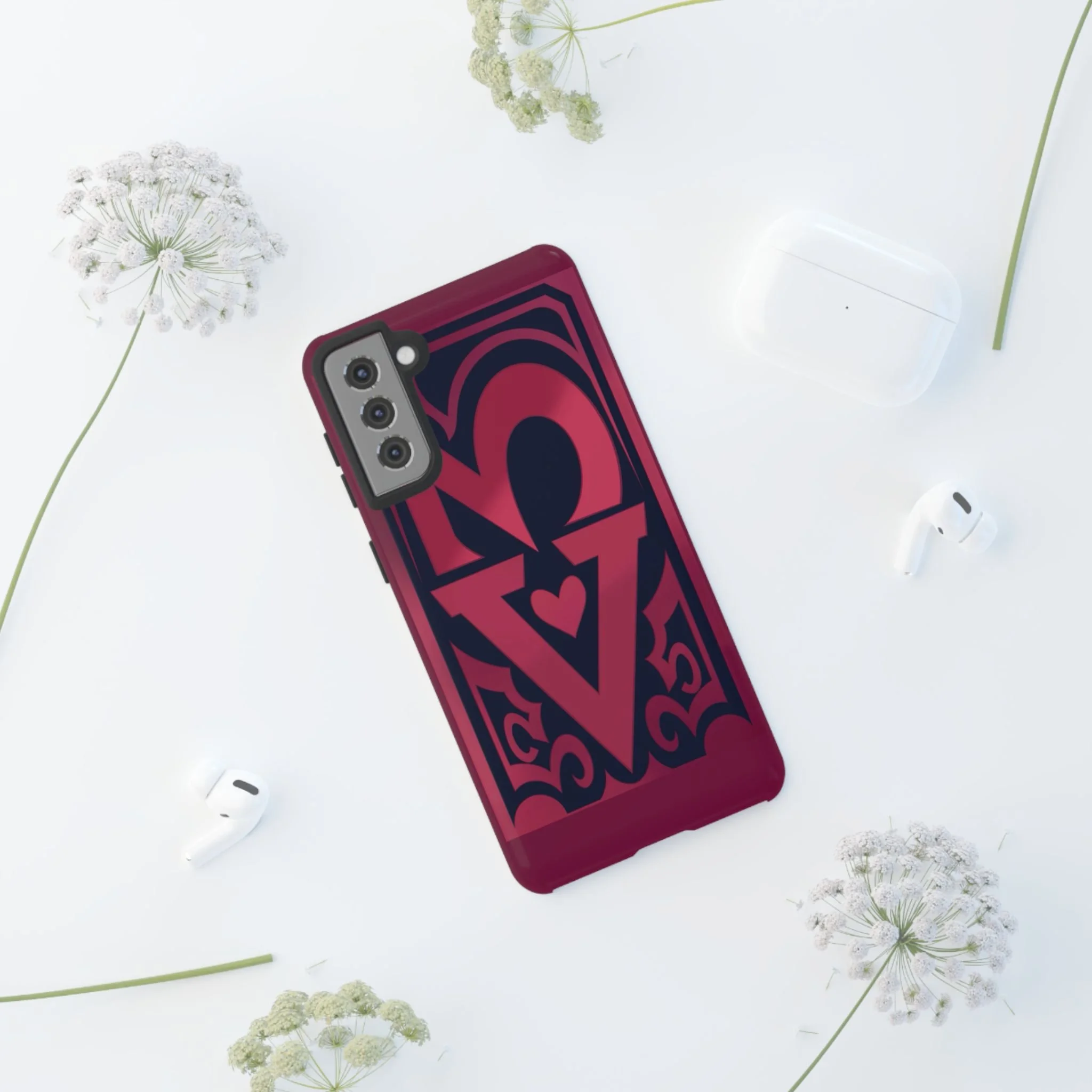 This protective phone case wraps your device in bold, graphic style and reliable defense. A deep burgundy shell frames a dark navy emblem — a stylized heart-and-V motif with decorative filigree — giving the case a modern, slightly gothic look that reads as both romantic and edgy. The dual-layer construction (hard polycarbonate exterior and soft TPU silicone liner) soaks up shocks and resists impacts, while the 3D wrap print keeps the design vivid across the curved edges. Finished options in glossy or matte let you choose the feel you prefer, and clear port cutouts keep charging and audio simple. Weather-resistant coatings and safety certifications mean it’s built to last and safe to use every day.