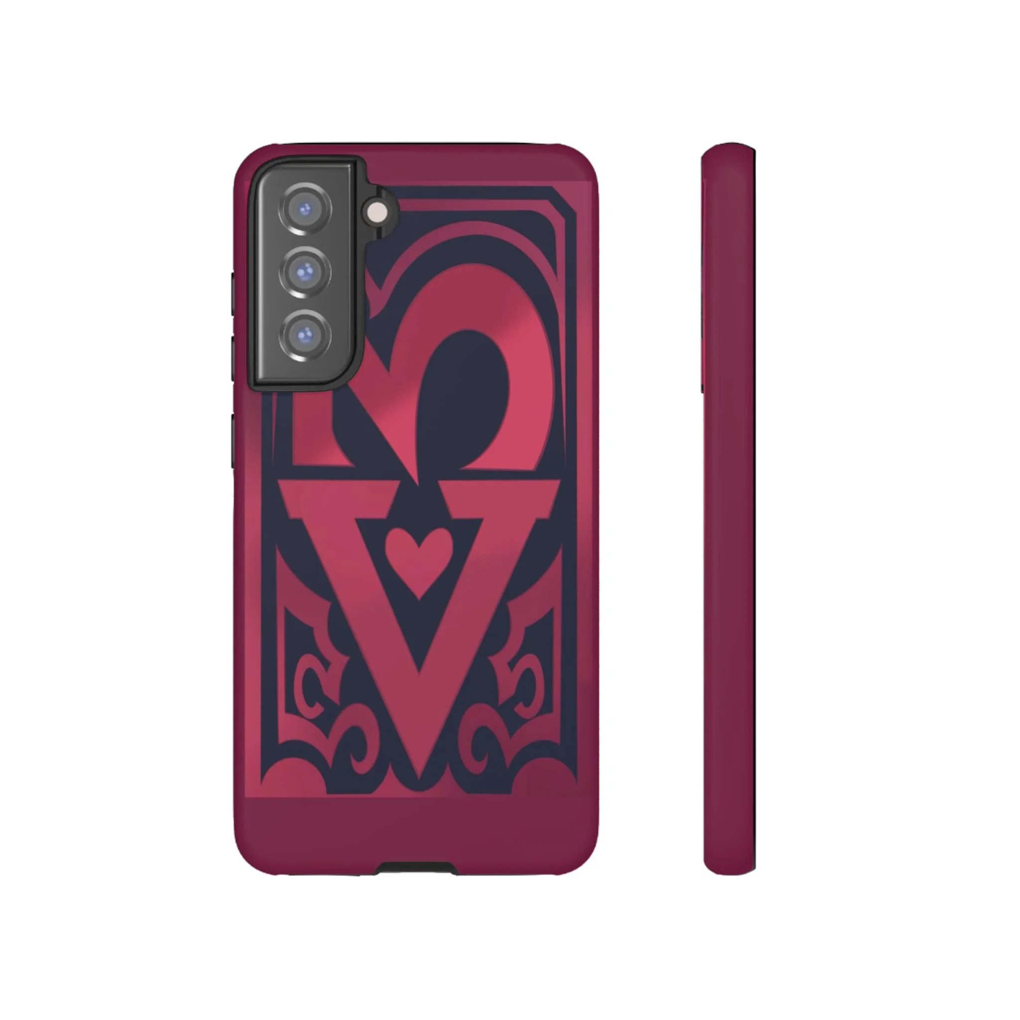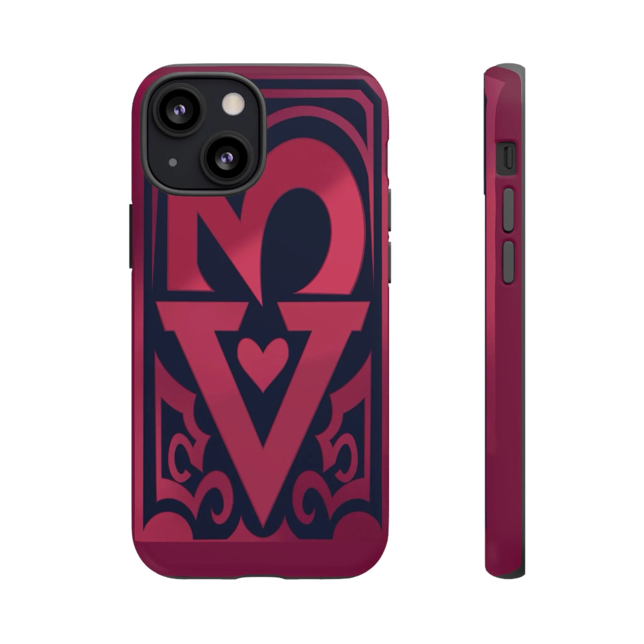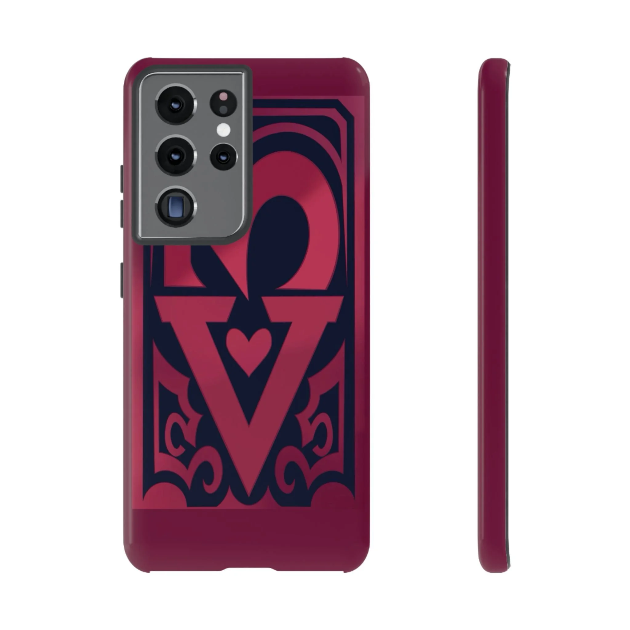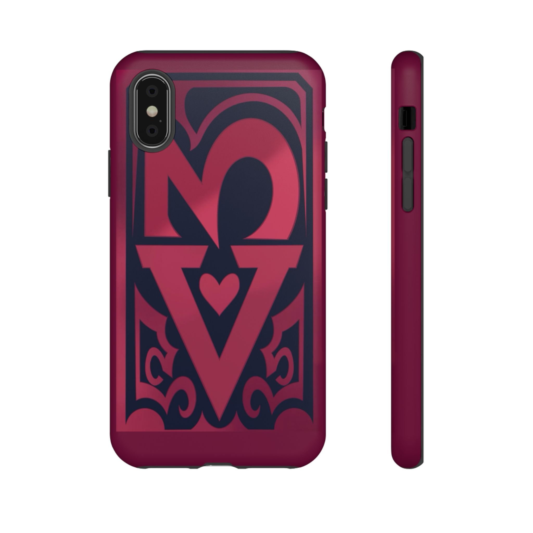 This protective phone case wraps your device in bold, graphic style and reliable defense. A deep burgundy shell frames a dark navy emblem — a stylized heart-and-V motif with decorative filigree — giving the case a modern, slightly gothic look that reads as both romantic and edgy. The dual-layer construction (hard polycarbonate exterior and soft TPU silicone liner) soaks up shocks and resists impacts, while the 3D wrap print keeps the design vivid across the curved edges. Finished options in glossy or matte let you choose the feel you prefer, and clear port cutouts keep charging and audio simple. Weather-resistant coatings and safety certifications mean it’s built to last and safe to use every day.