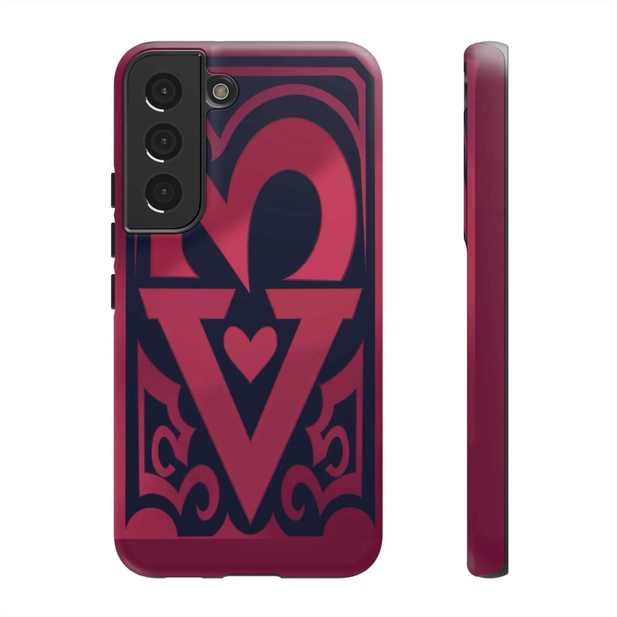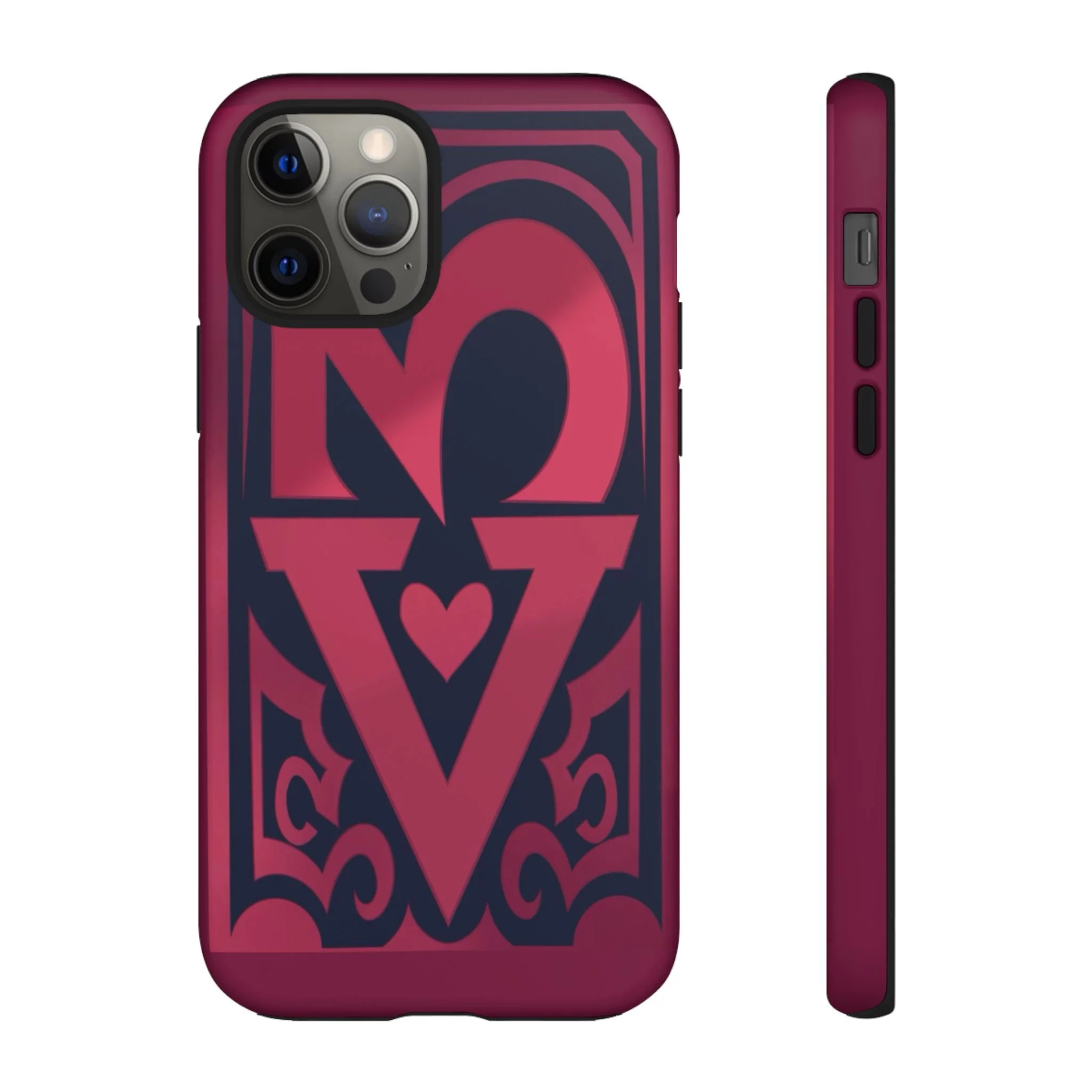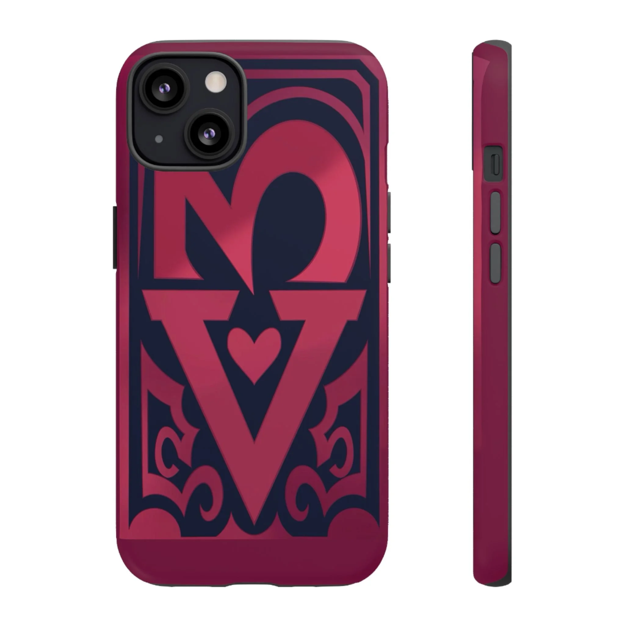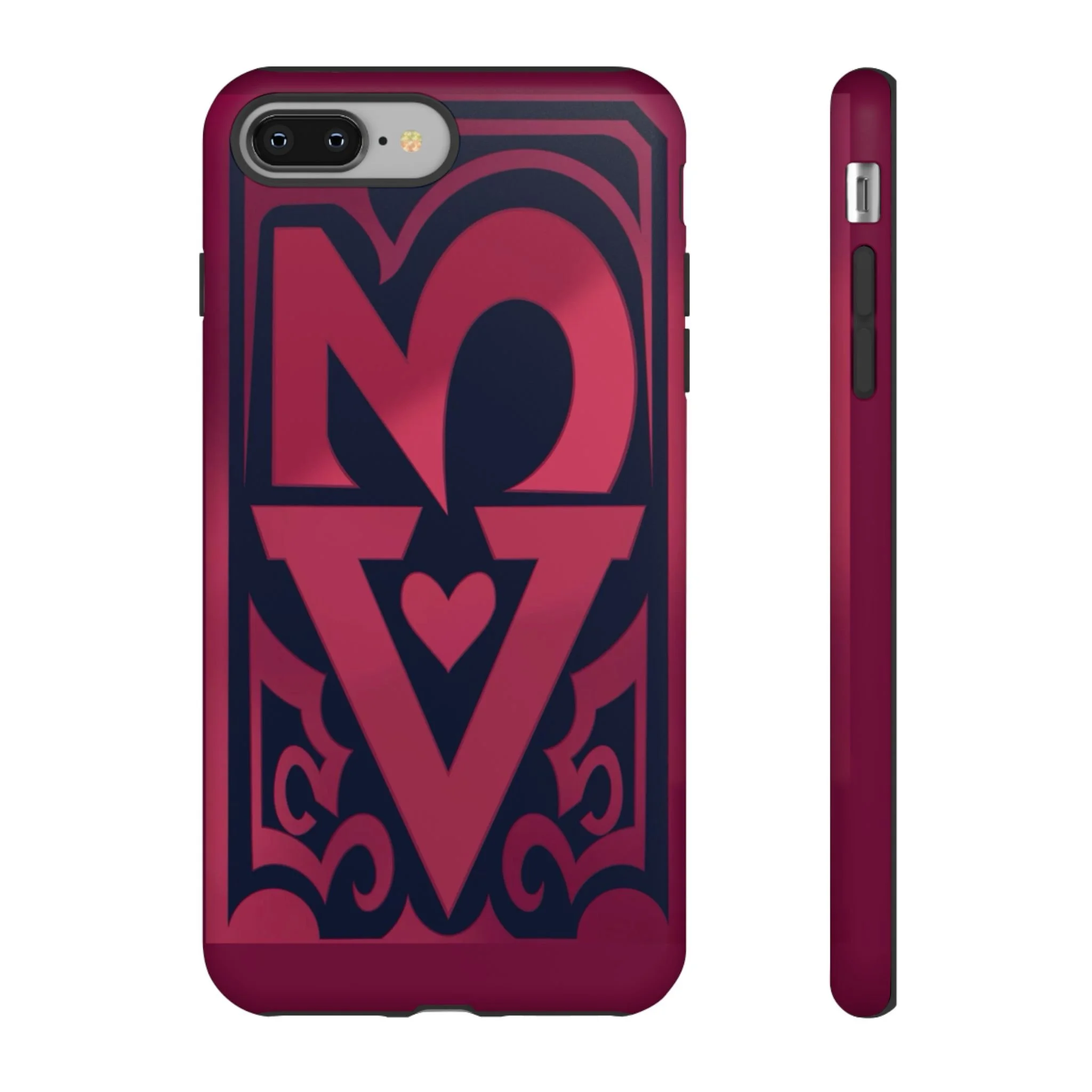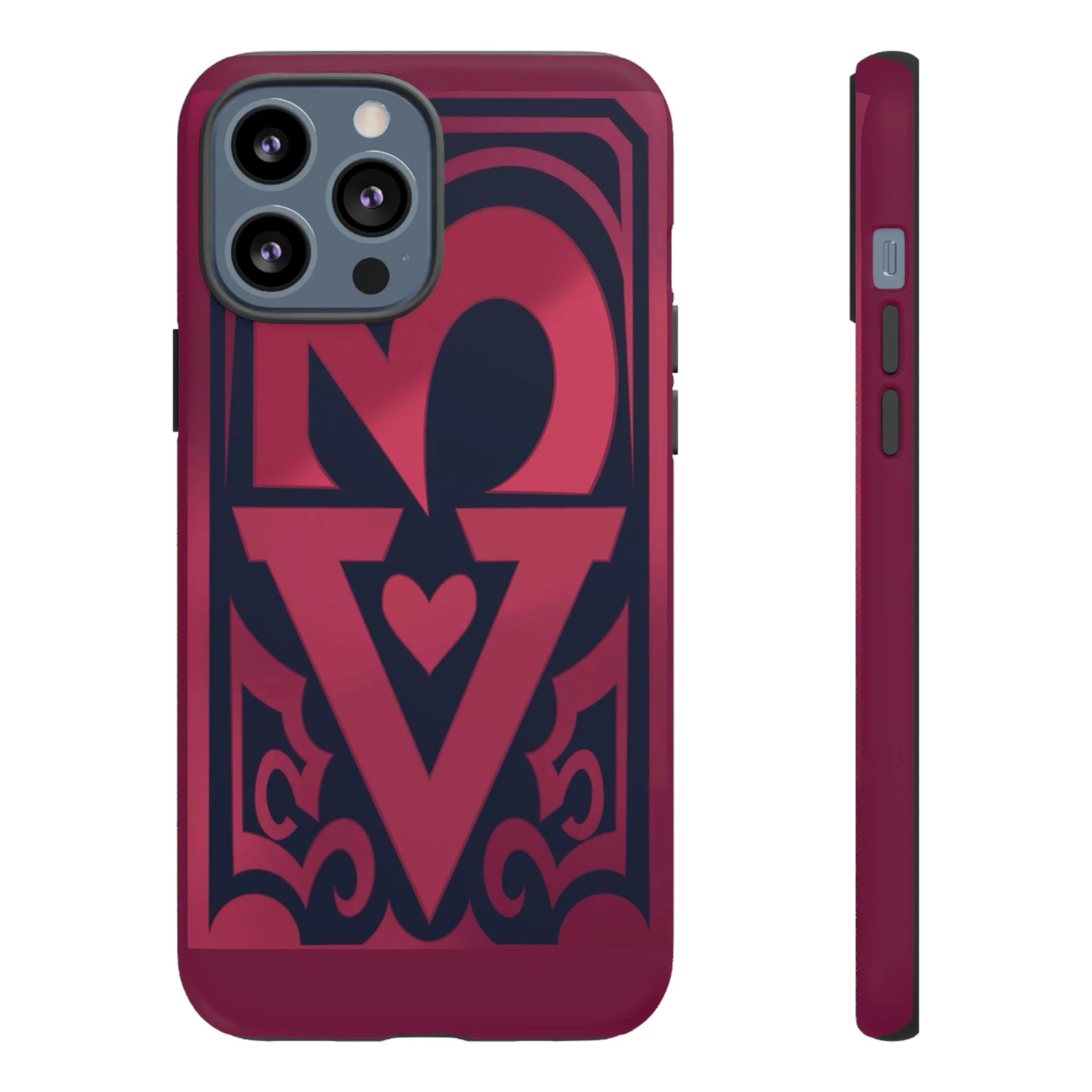 This protective phone case wraps your device in bold, graphic style and reliable defense. A deep burgundy shell frames a dark navy emblem — a stylized heart-and-V motif with decorative filigree — giving the case a modern, slightly gothic look that reads as both romantic and edgy. The dual-layer construction (hard polycarbonate exterior and soft TPU silicone liner) soaks up shocks and resists impacts, while the 3D wrap print keeps the design vivid across the curved edges. Finished options in glossy or matte let you choose the feel you prefer, and clear port cutouts keep charging and audio simple. Weather-resistant coatings and safety certifications mean it’s built to last and safe to use every day.