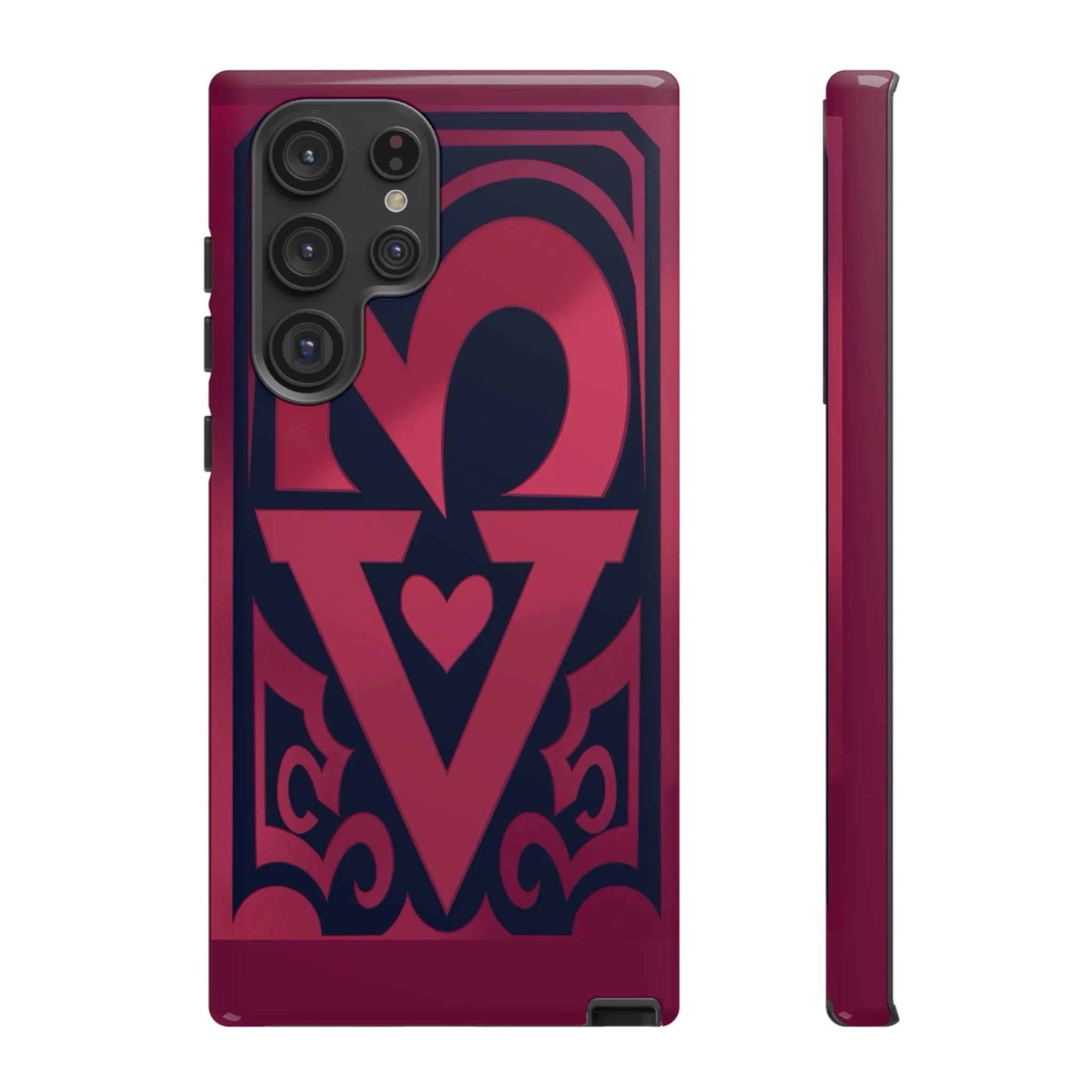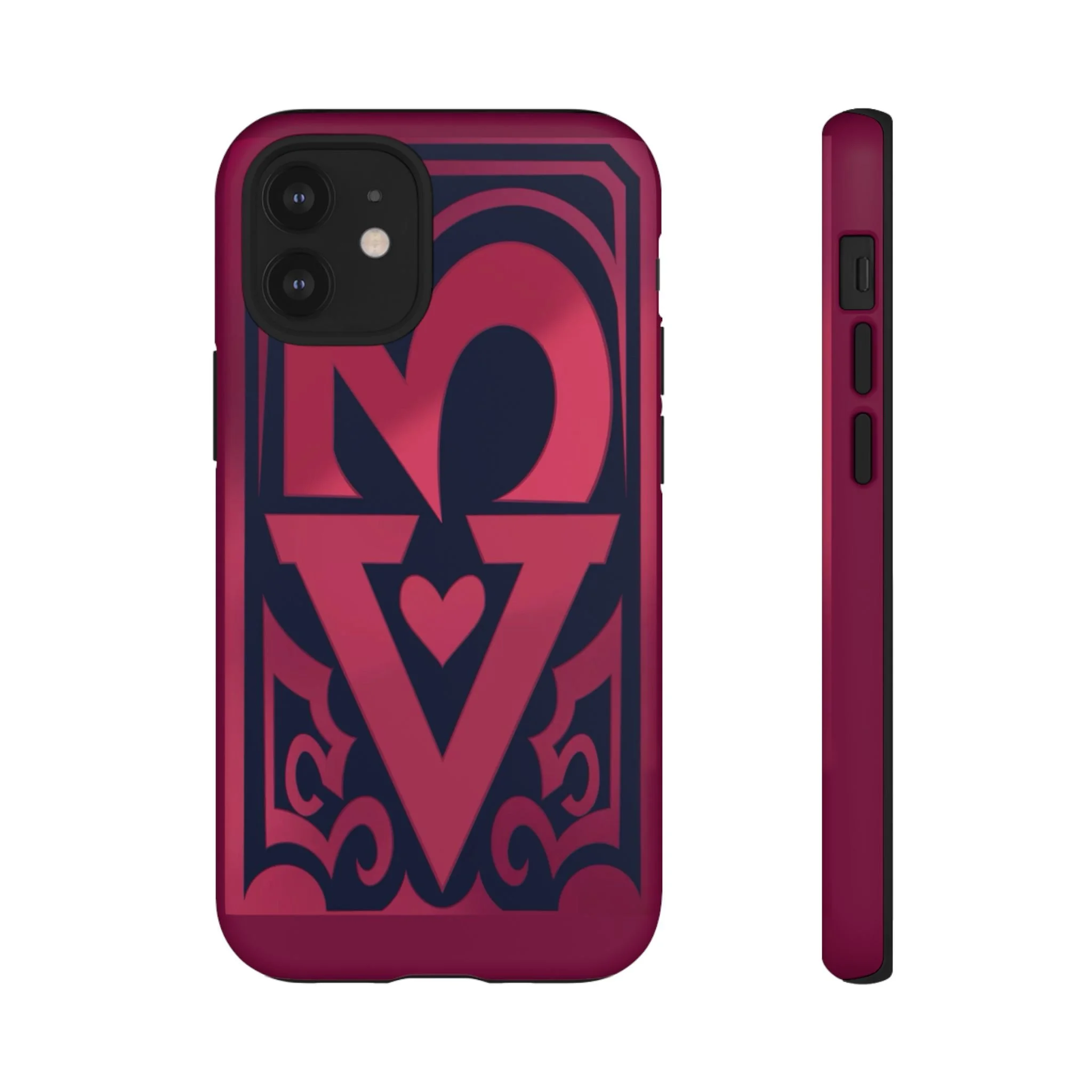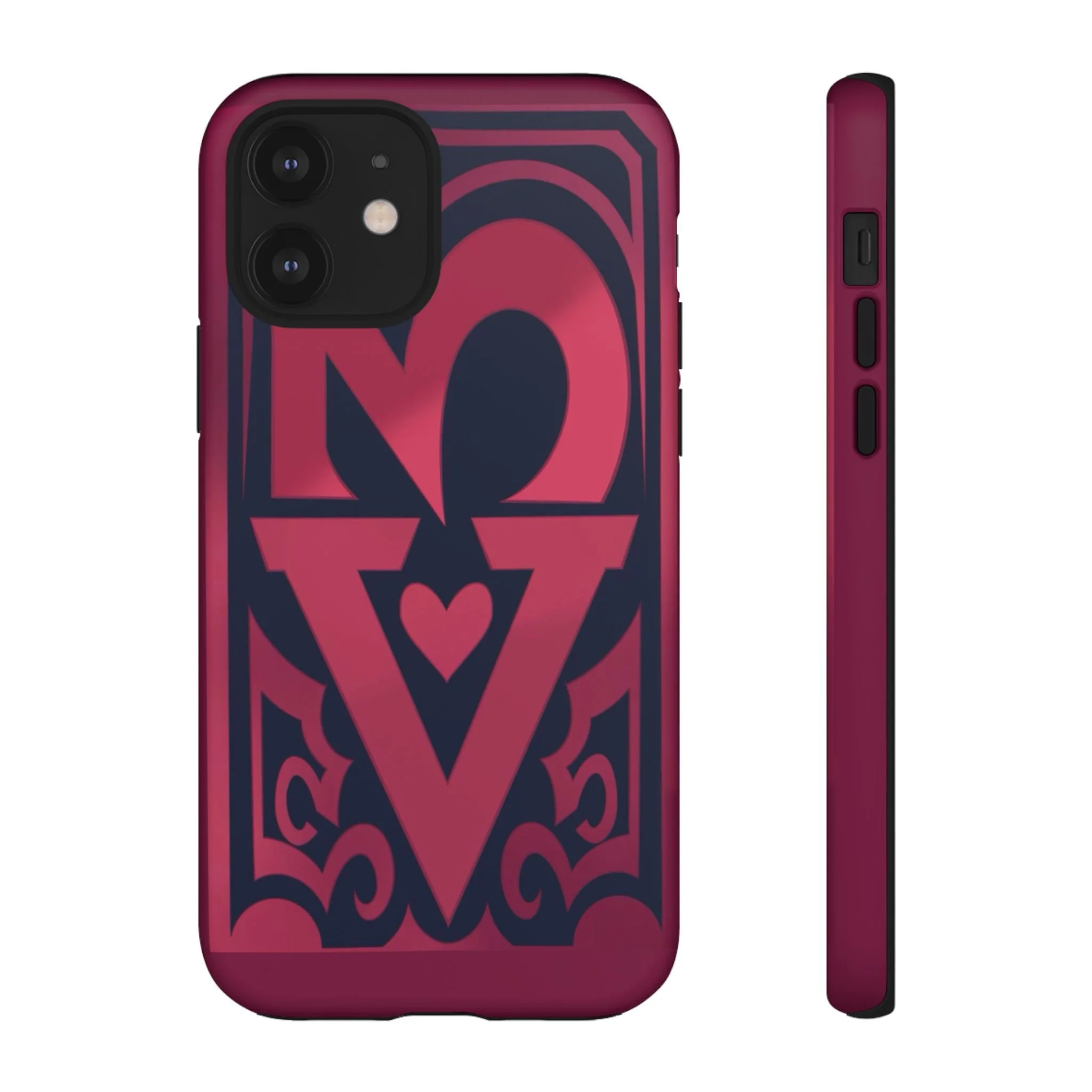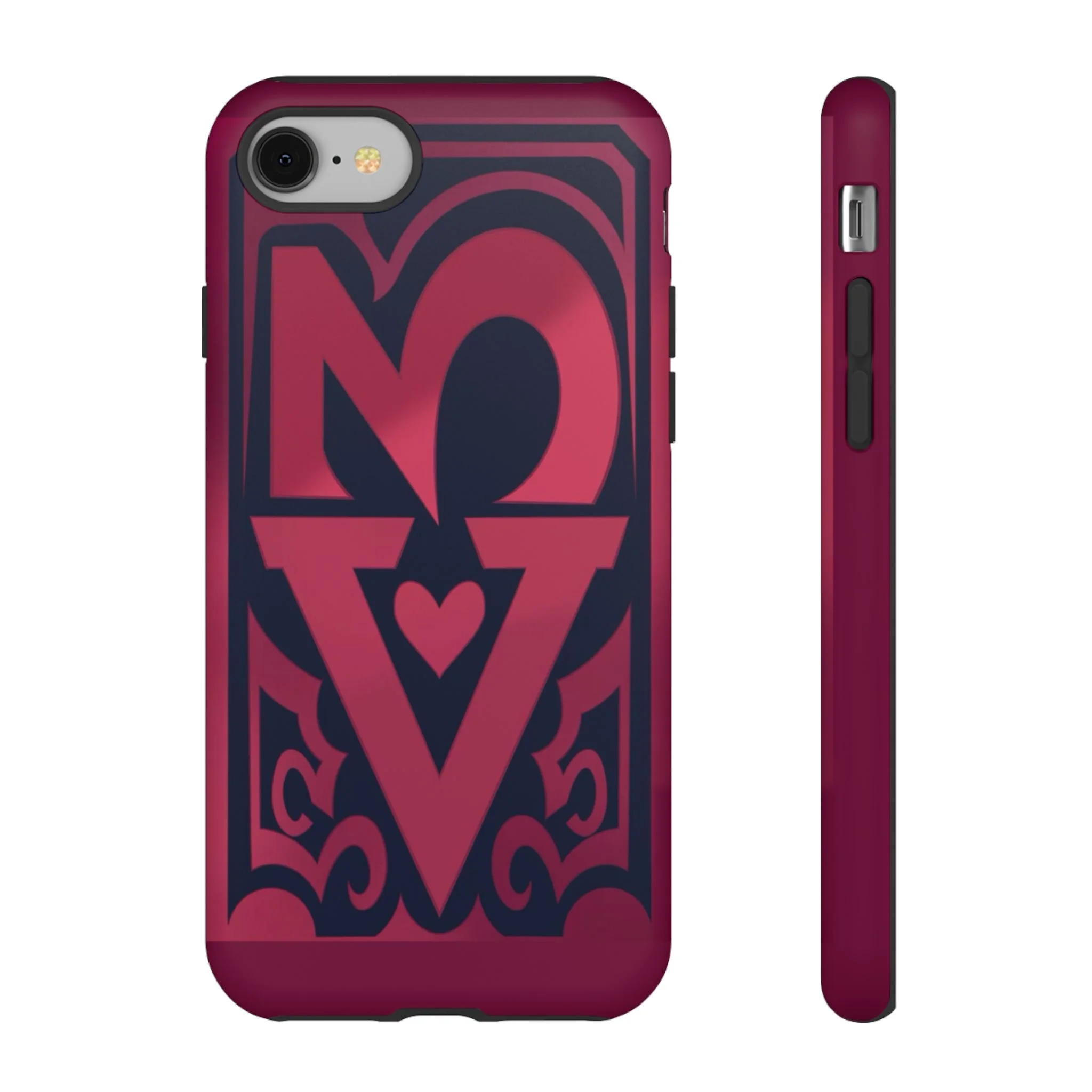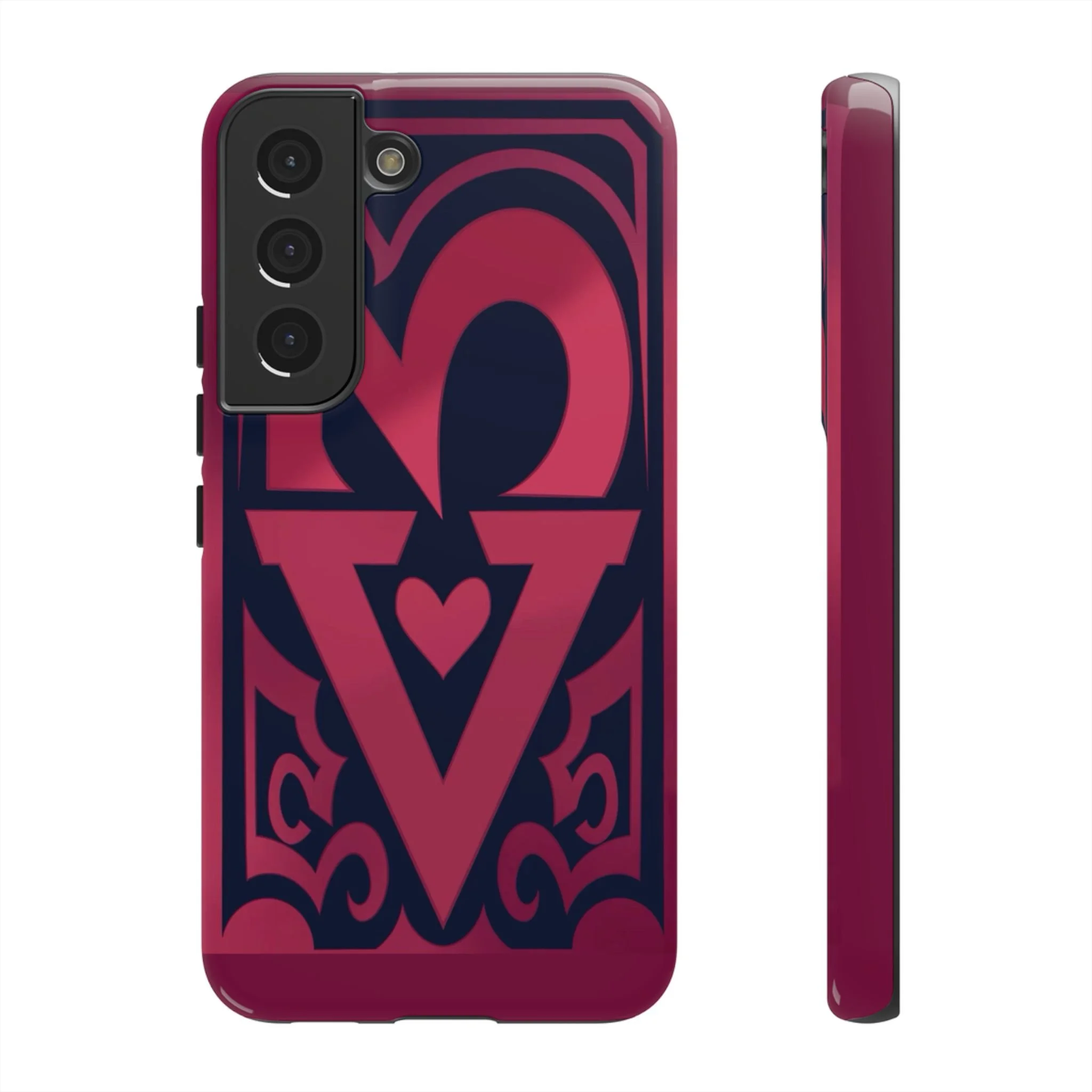 This protective phone case wraps your device in bold, graphic style and reliable defense. A deep burgundy shell frames a dark navy emblem — a stylized heart-and-V motif with decorative filigree — giving the case a modern, slightly gothic look that reads as both romantic and edgy. The dual-layer construction (hard polycarbonate exterior and soft TPU silicone liner) soaks up shocks and resists impacts, while the 3D wrap print keeps the design vivid across the curved edges. Finished options in glossy or matte let you choose the feel you prefer, and clear port cutouts keep charging and audio simple. Weather-resistant coatings and safety certifications mean it’s built to last and safe to use every day.