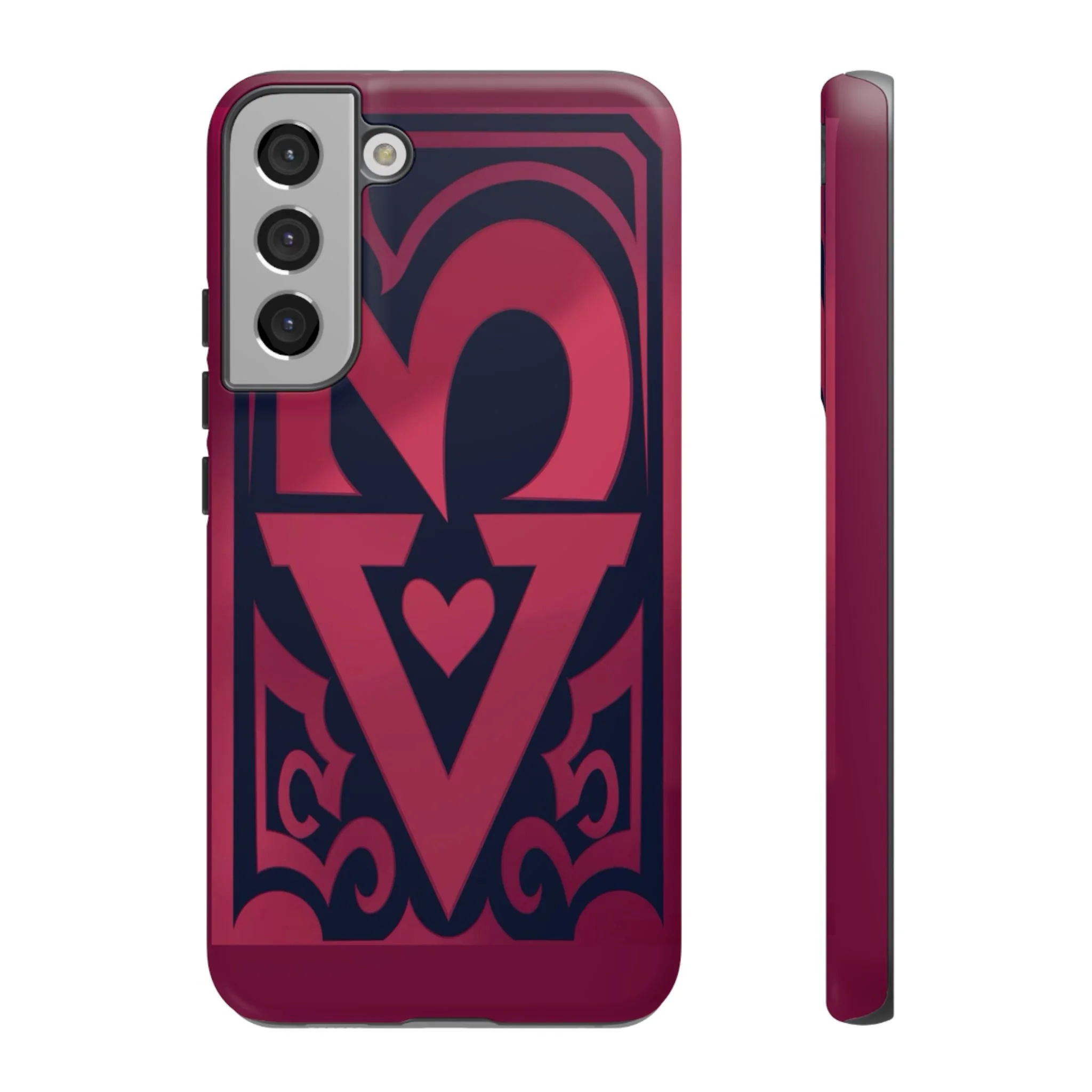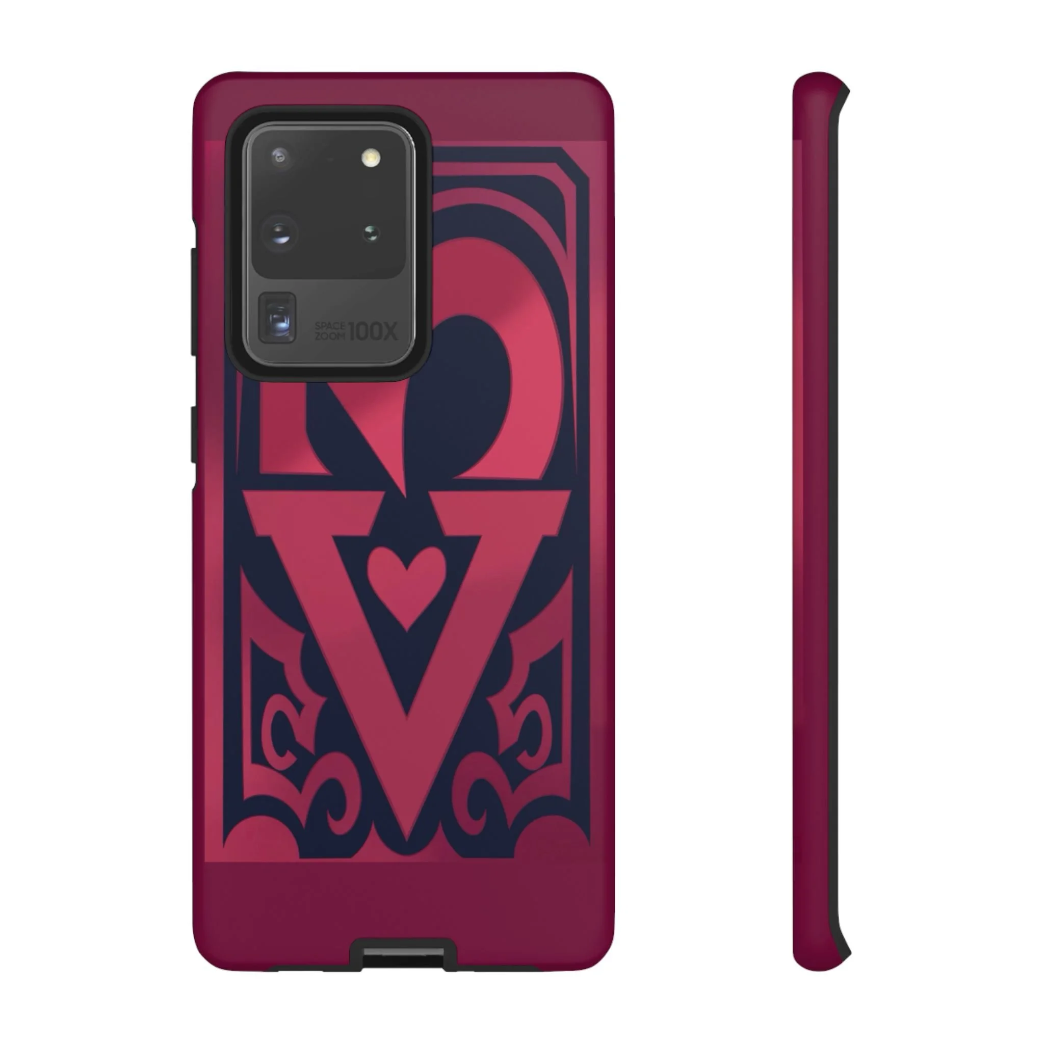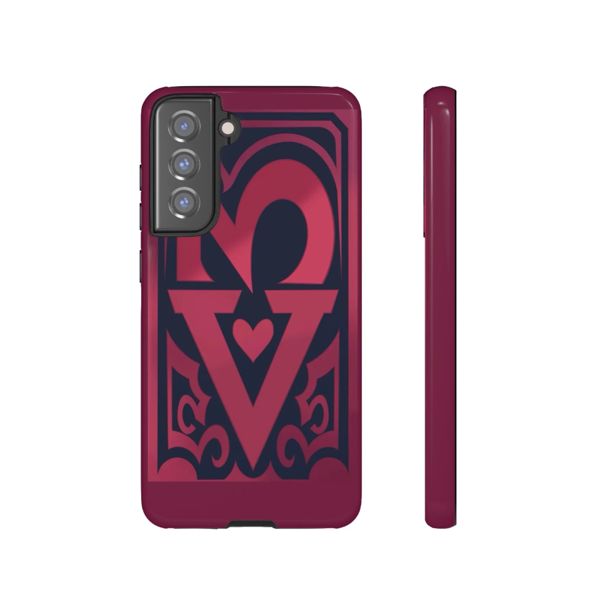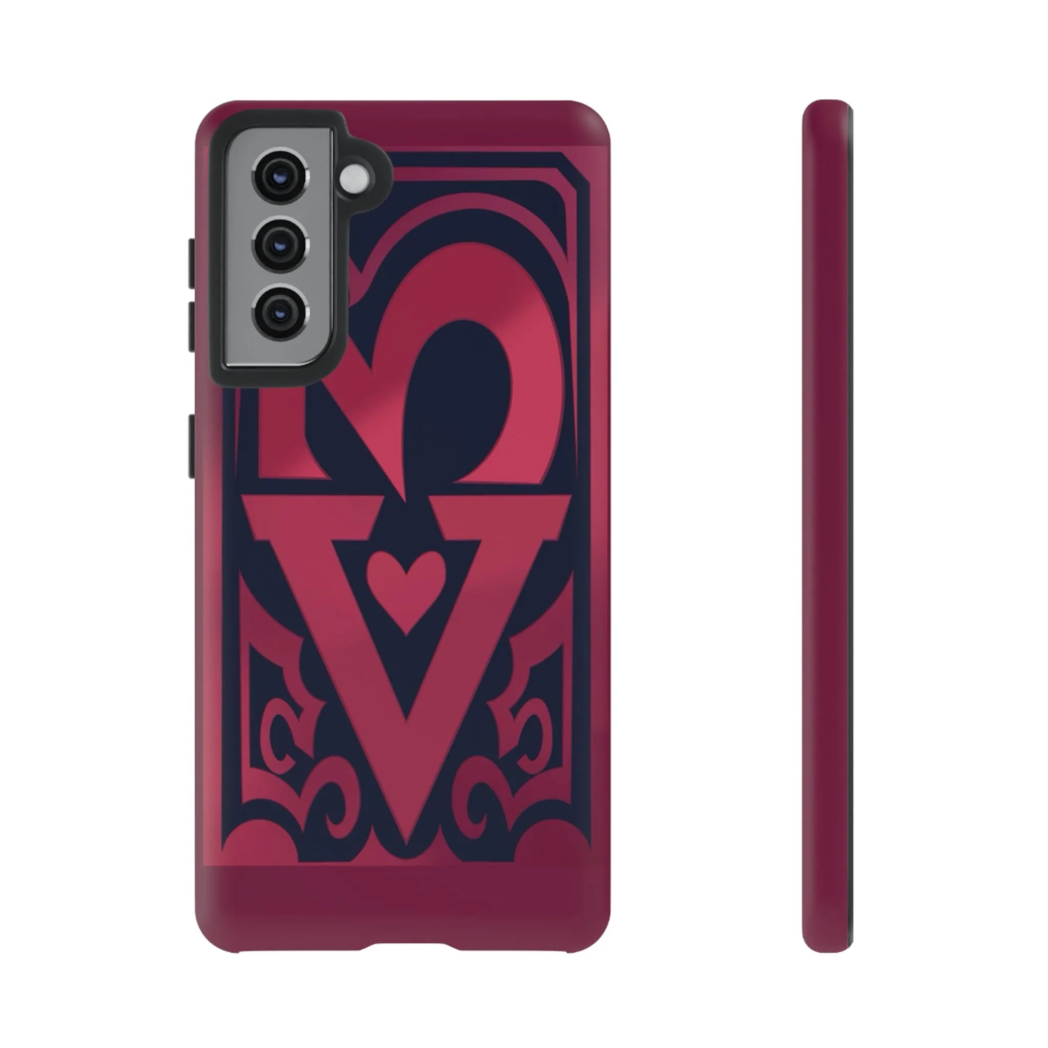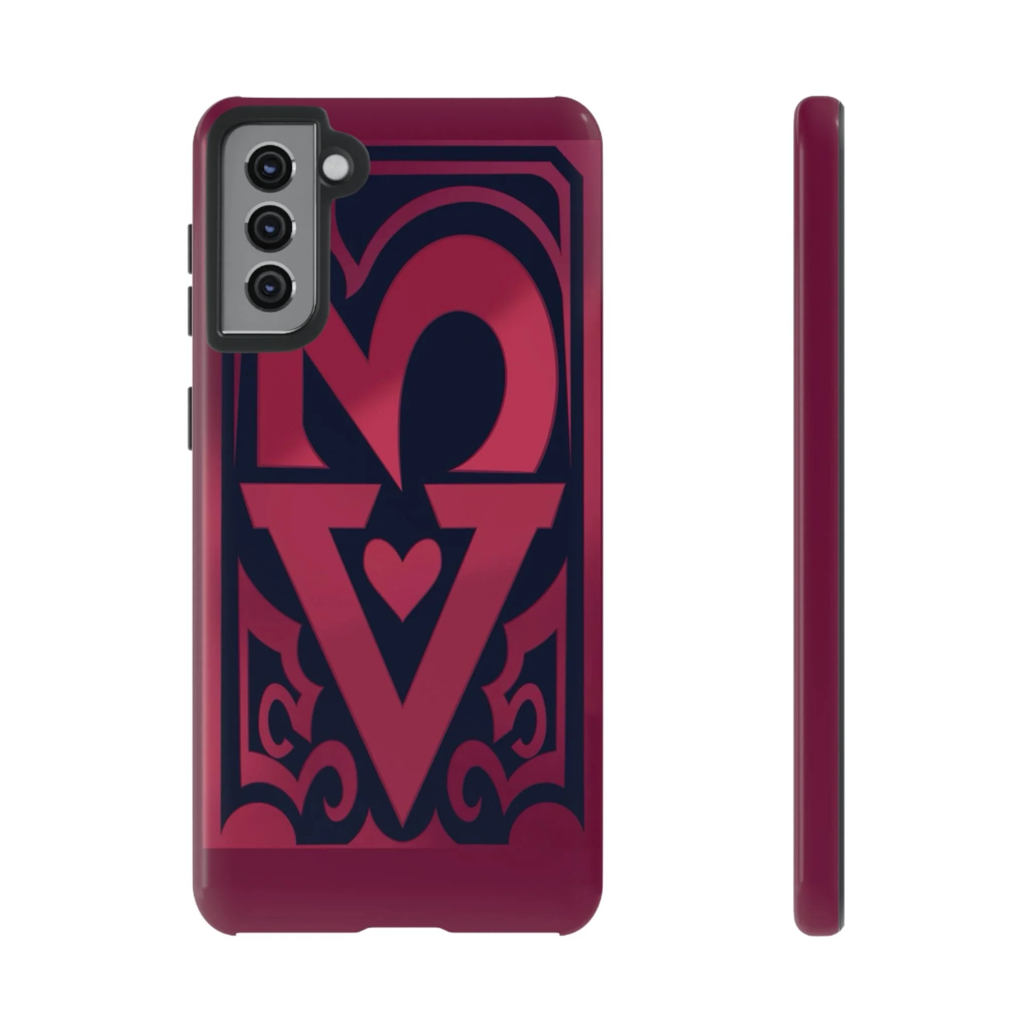 This protective phone case wraps your device in bold, graphic style and reliable defense. A deep burgundy shell frames a dark navy emblem — a stylized heart-and-V motif with decorative filigree — giving the case a modern, slightly gothic look that reads as both romantic and edgy. The dual-layer construction (hard polycarbonate exterior and soft TPU silicone liner) soaks up shocks and resists impacts, while the 3D wrap print keeps the design vivid across the curved edges. Finished options in glossy or matte let you choose the feel you prefer, and clear port cutouts keep charging and audio simple. Weather-resistant coatings and safety certifications mean it’s built to last and safe to use every day.