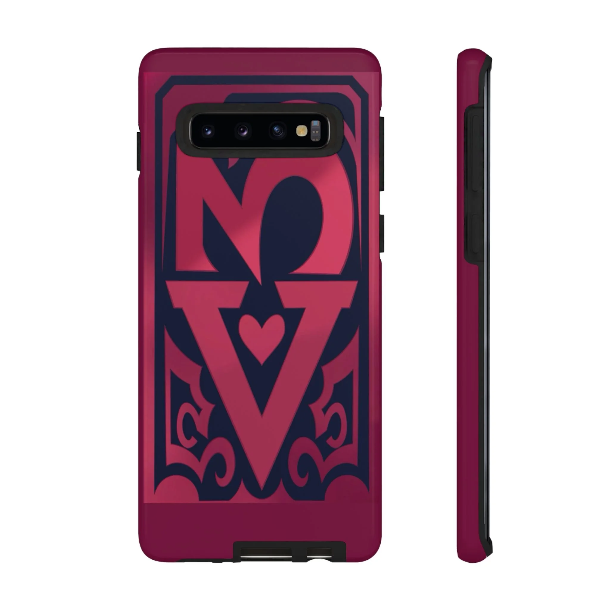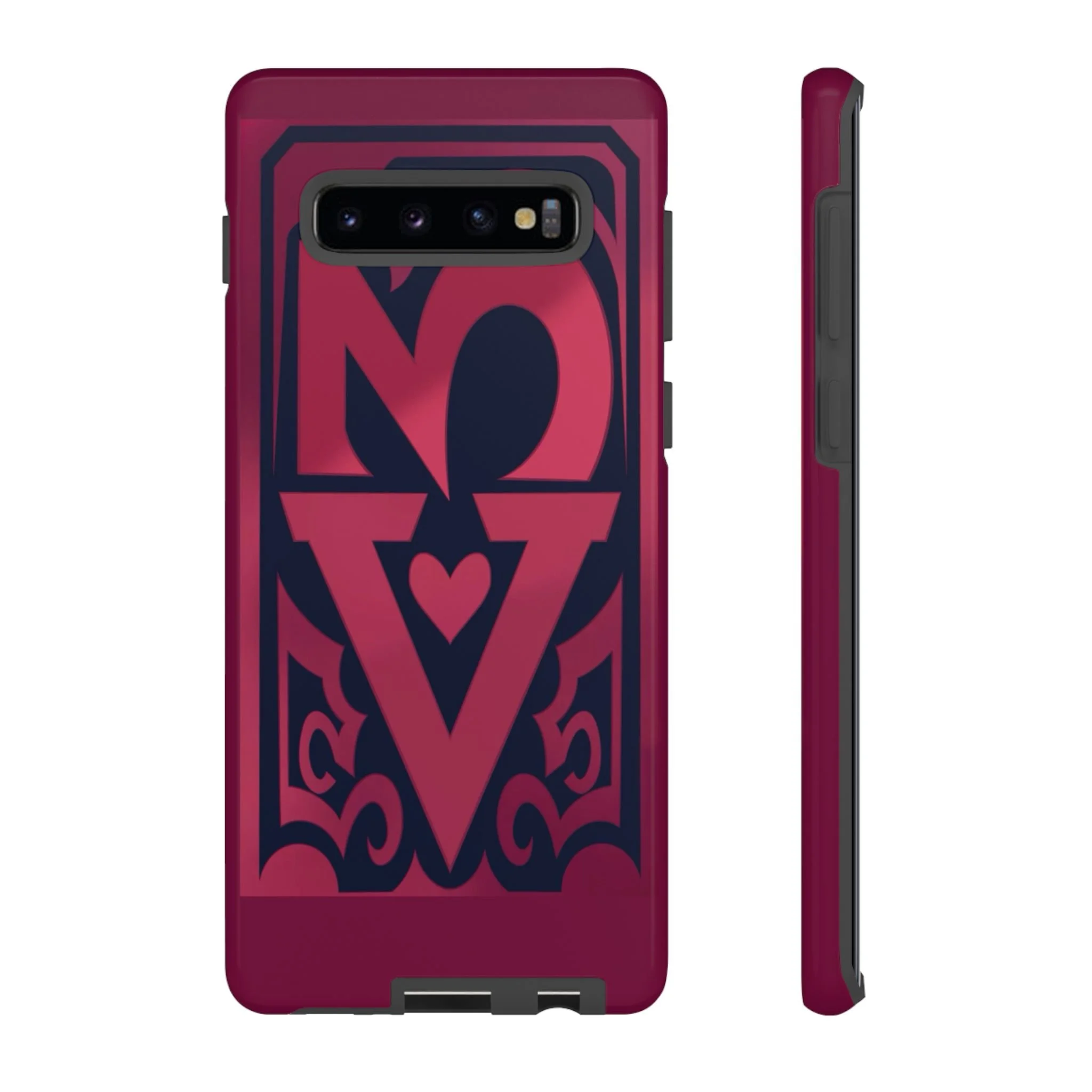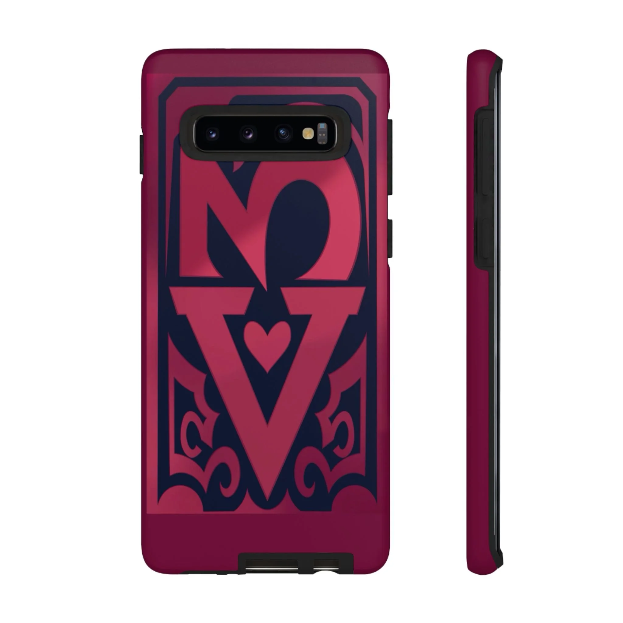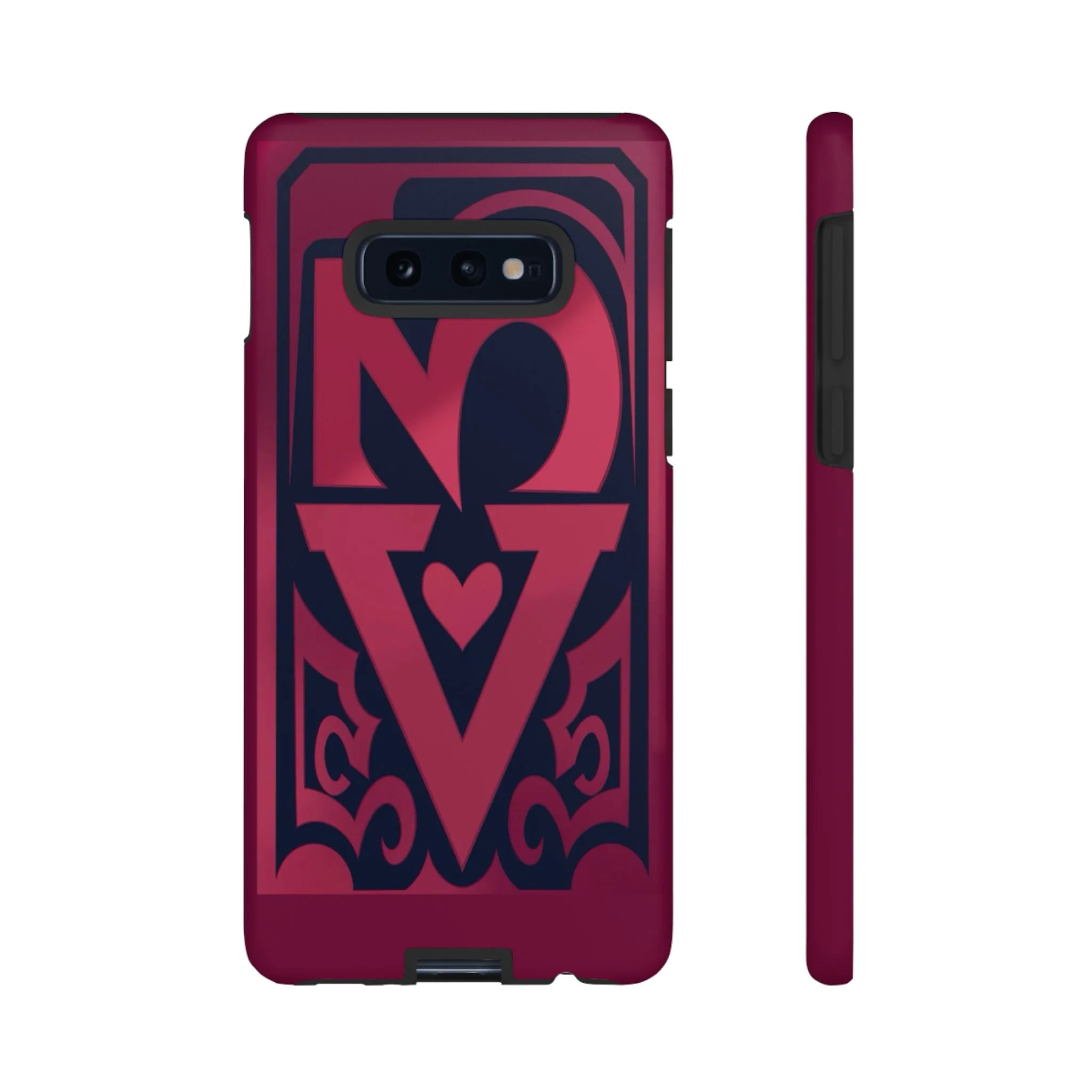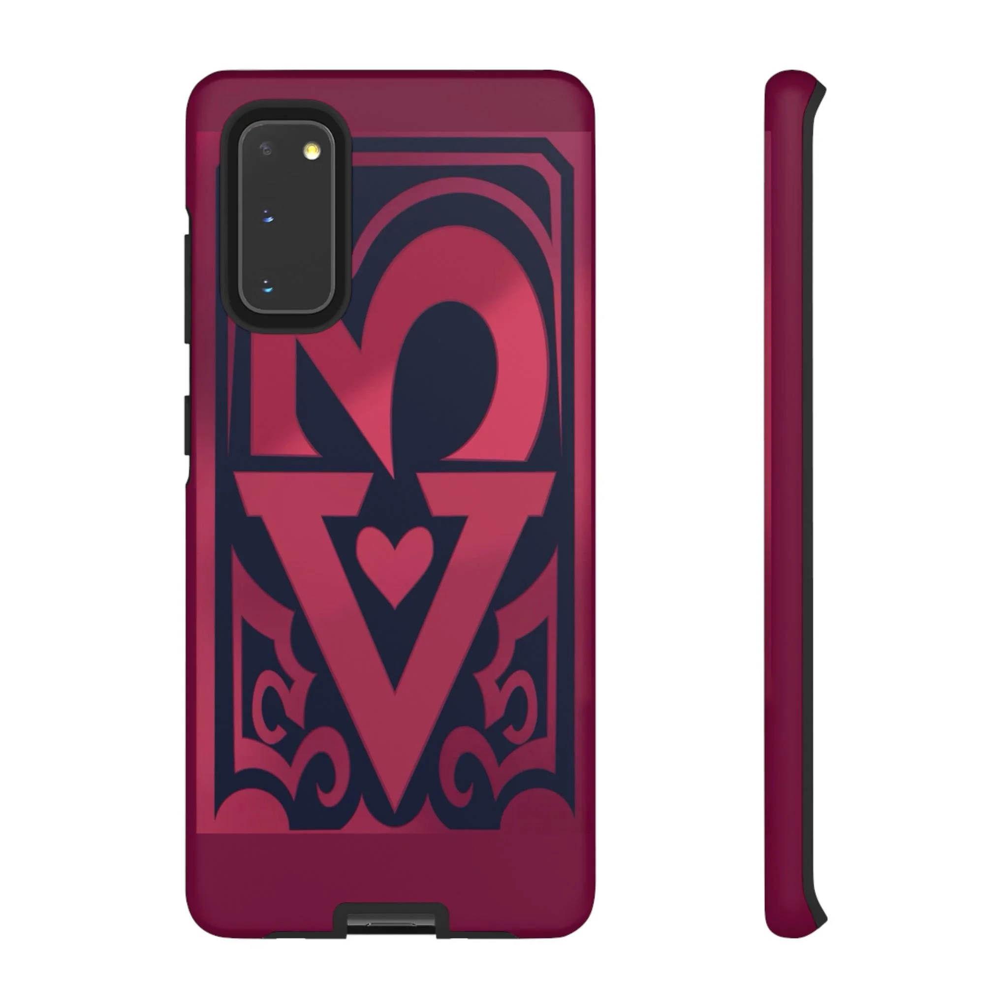 This protective phone case wraps your device in bold, graphic style and reliable defense. A deep burgundy shell frames a dark navy emblem — a stylized heart-and-V motif with decorative filigree — giving the case a modern, slightly gothic look that reads as both romantic and edgy. The dual-layer construction (hard polycarbonate exterior and soft TPU silicone liner) soaks up shocks and resists impacts, while the 3D wrap print keeps the design vivid across the curved edges. Finished options in glossy or matte let you choose the feel you prefer, and clear port cutouts keep charging and audio simple. Weather-resistant coatings and safety certifications mean it’s built to last and safe to use every day.